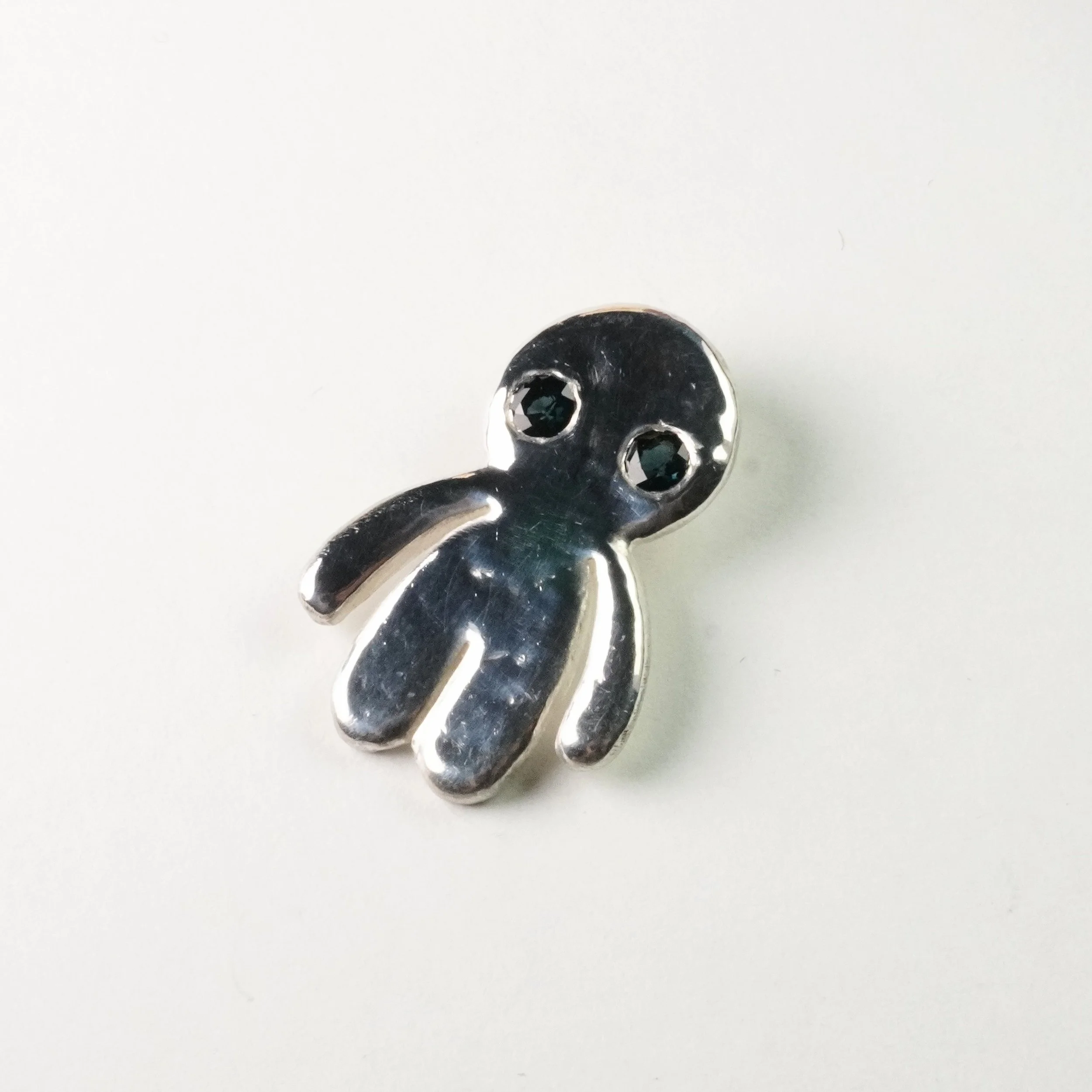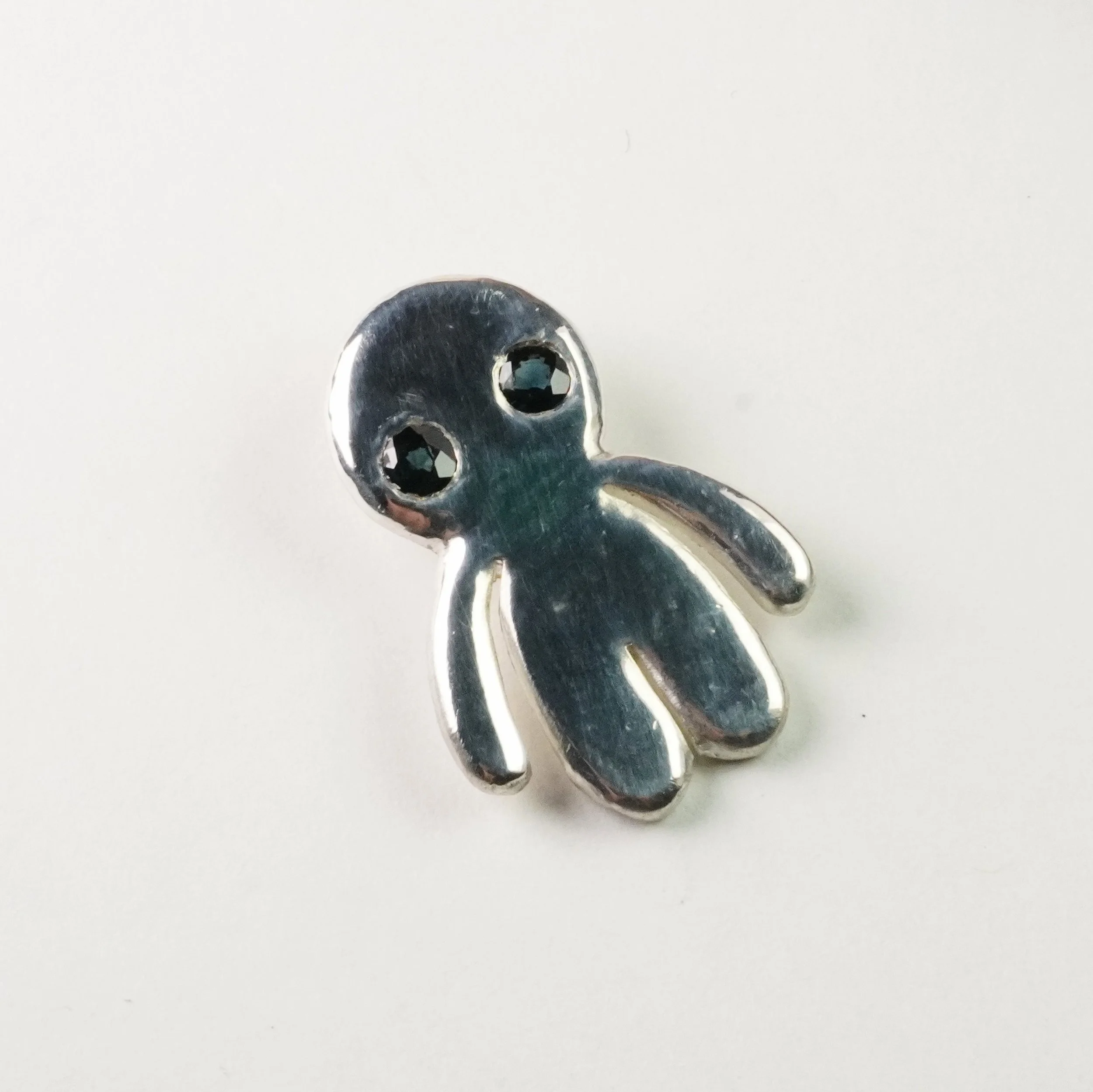 Silver charm in the shape of a cute, simplified cartoon octopus with large eyes, lying on a white surface.