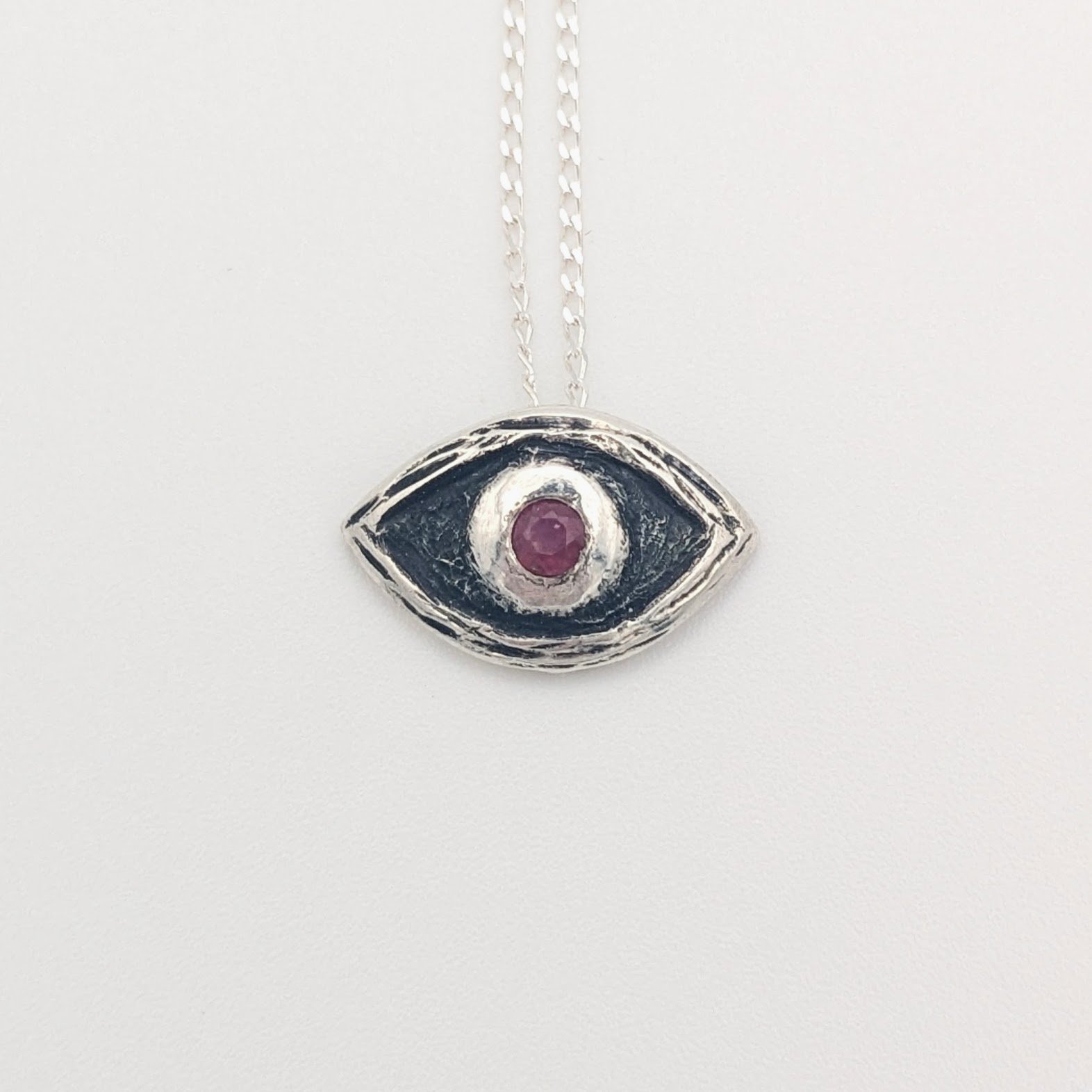 Silver eye-shaped pendant necklace with a purple gemstone in the center, hanging from a chain.