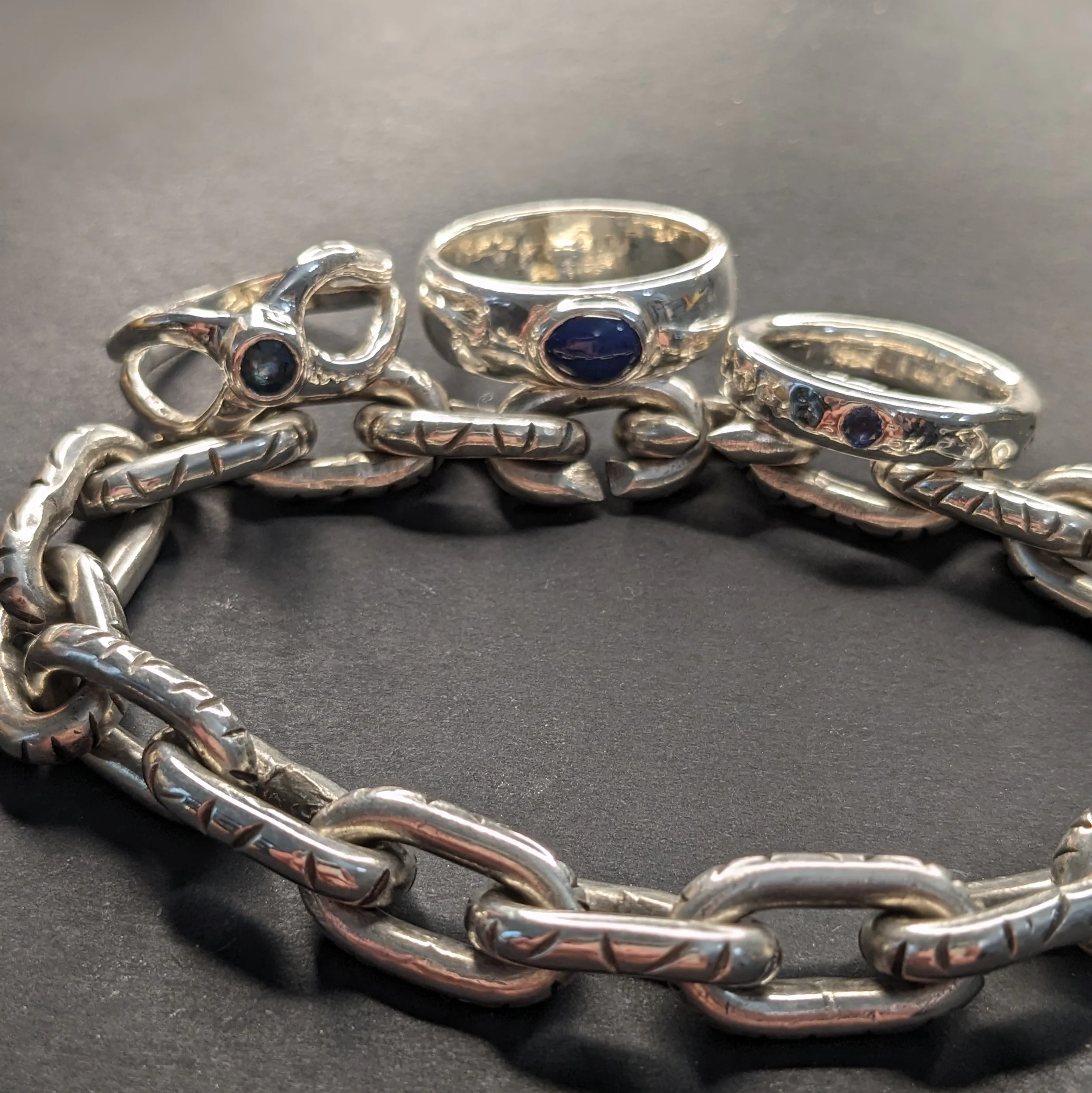 Three silver rings with dark blue stones and a silver chain bracelet on a black background.