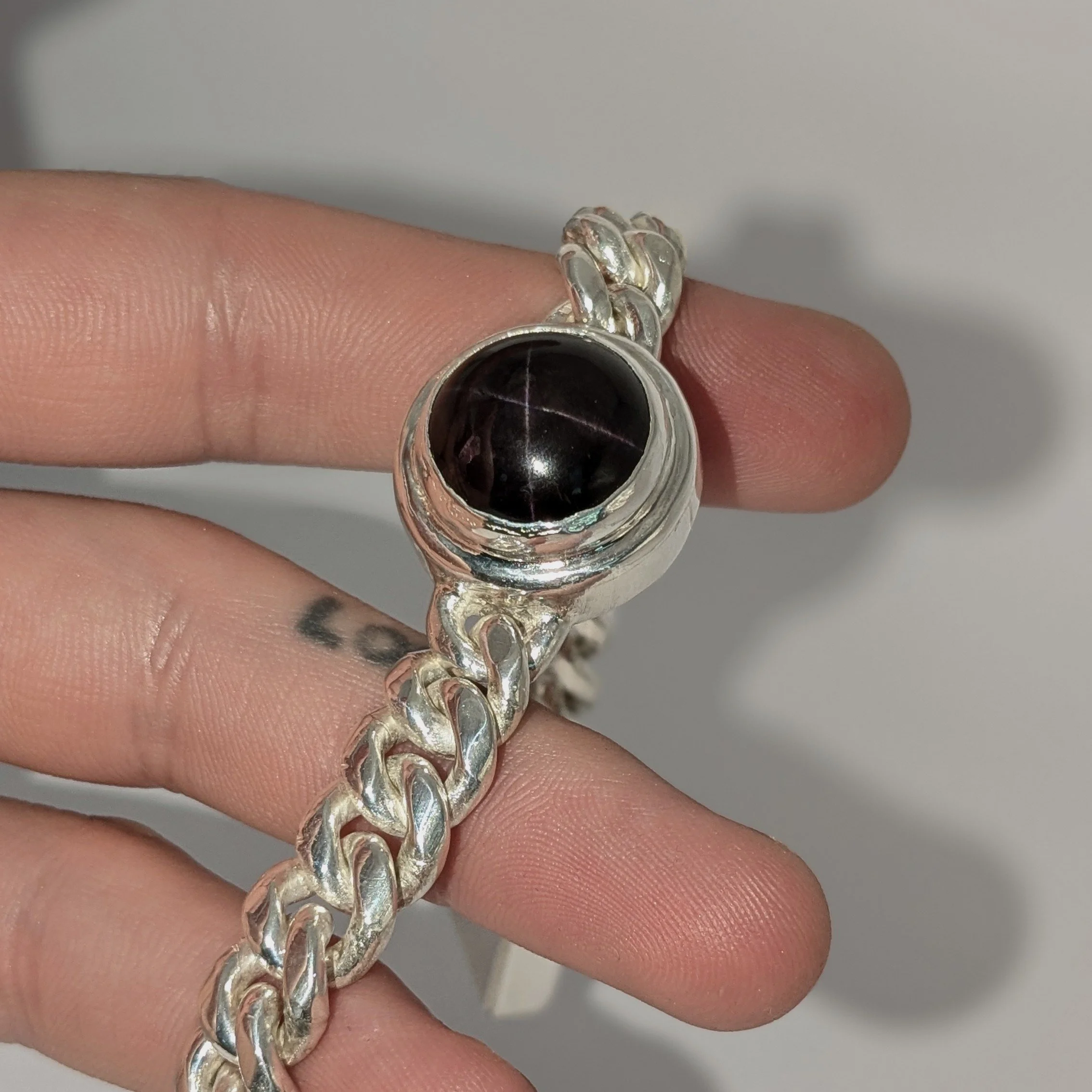 A silver chain bracelet with a round black gemstone or bead in a bezel setting.