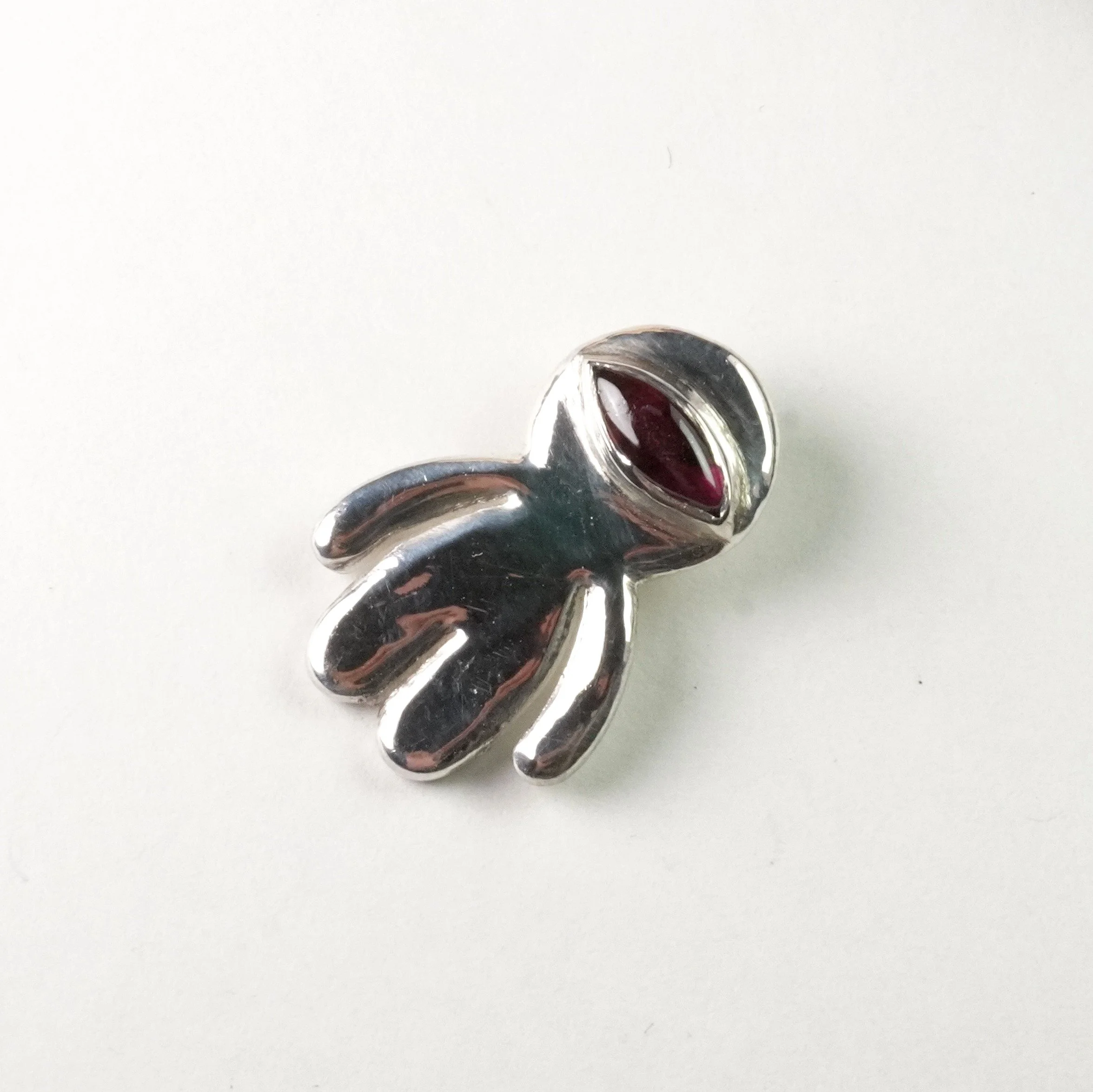Silver brooch shaped like a hand with a circular gemstone eye, on a plain white background.