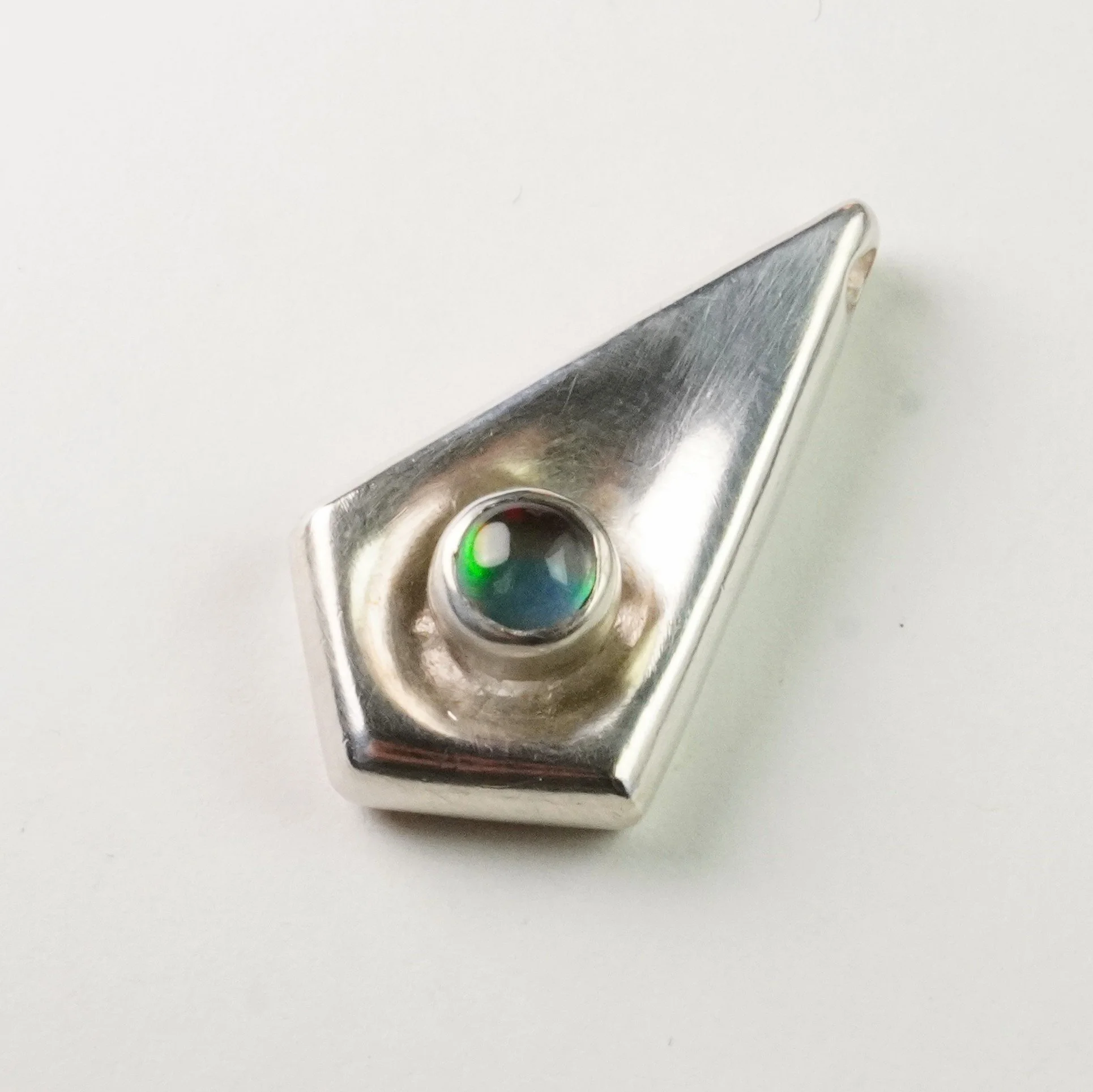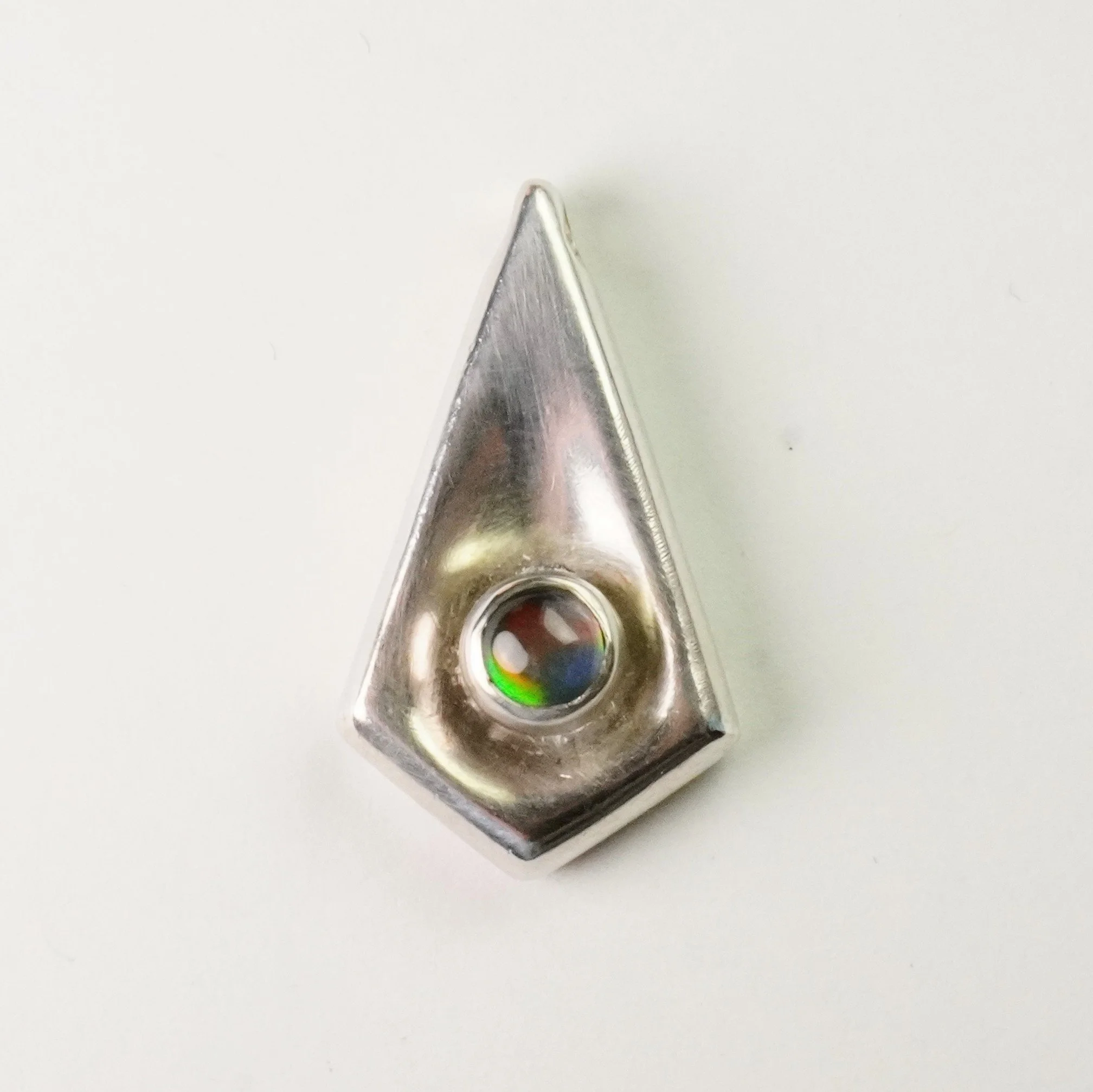 Silver pendant with an oval-shaped opal gemstone featuring green, red, and blue fire, enclosed within a diamond-shaped silver frame.