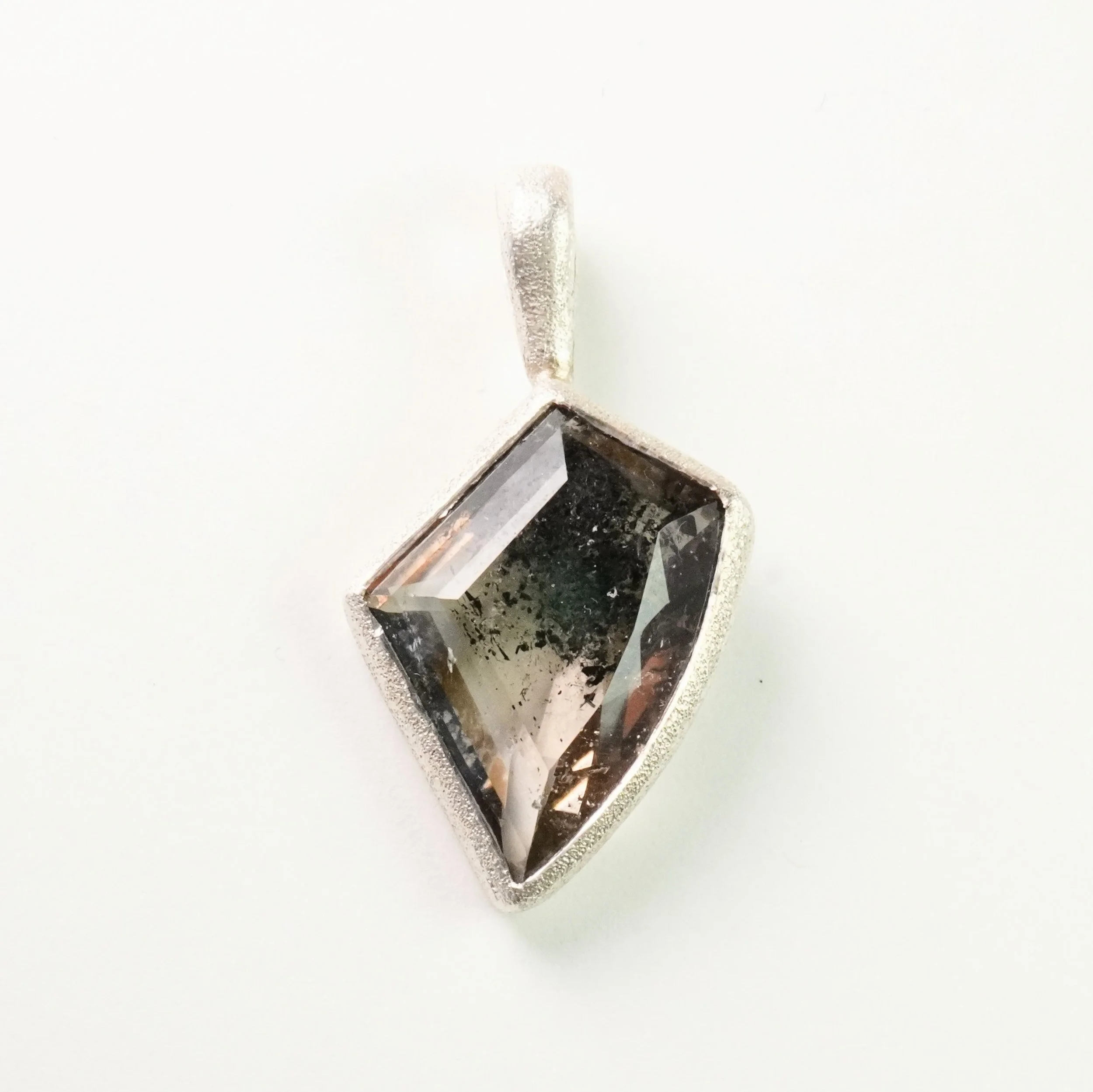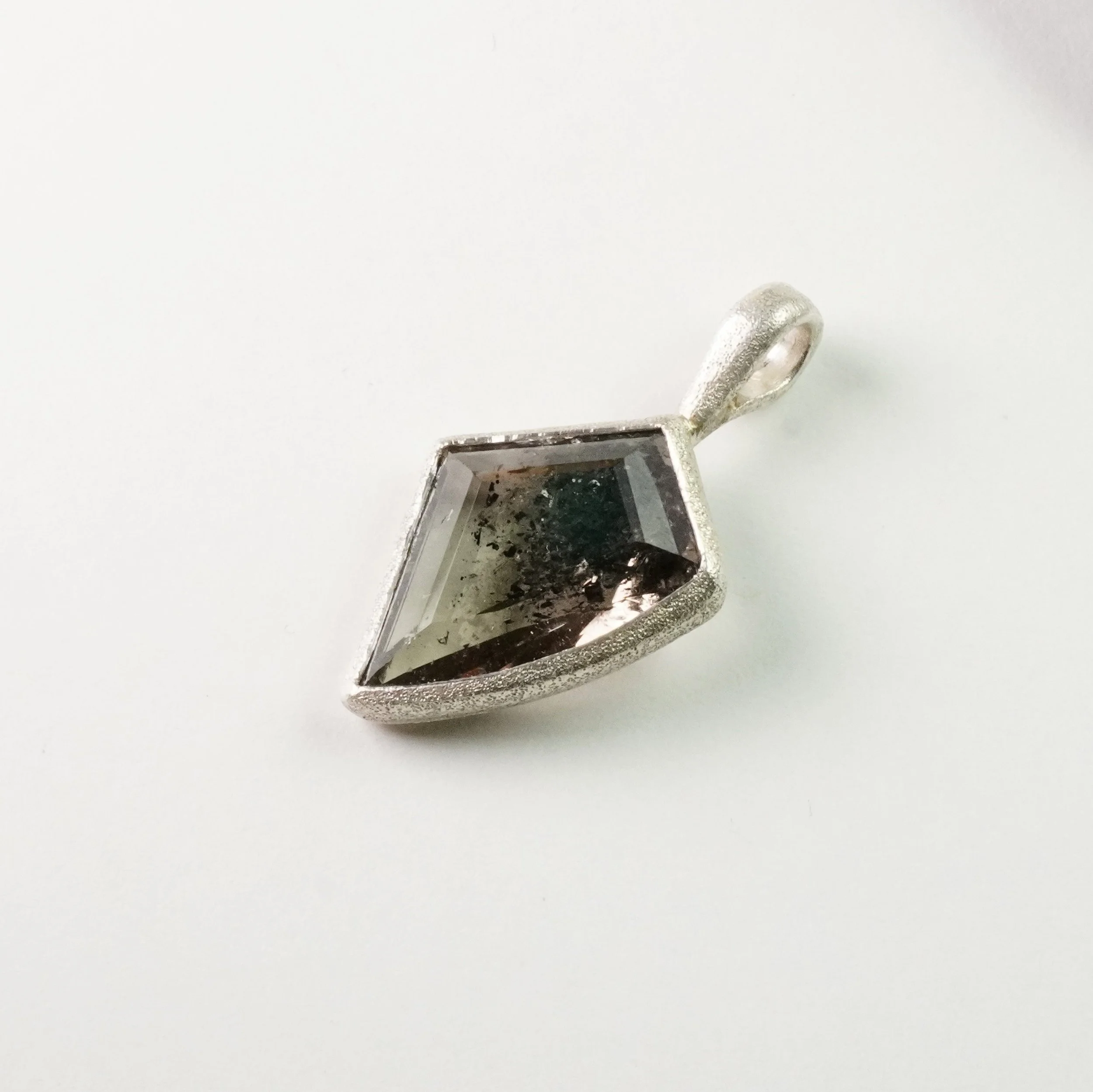 Silver necklace with a pendant featuring a round, multicolored gemstone set within an elongated, diamond-shaped silver frame.