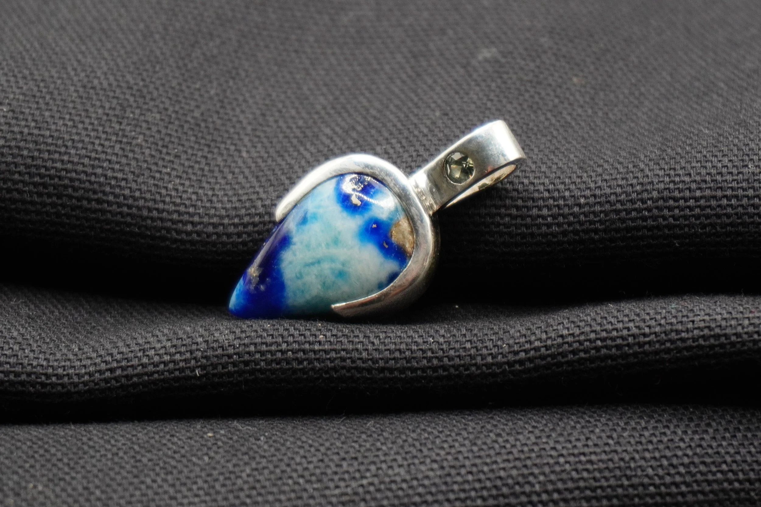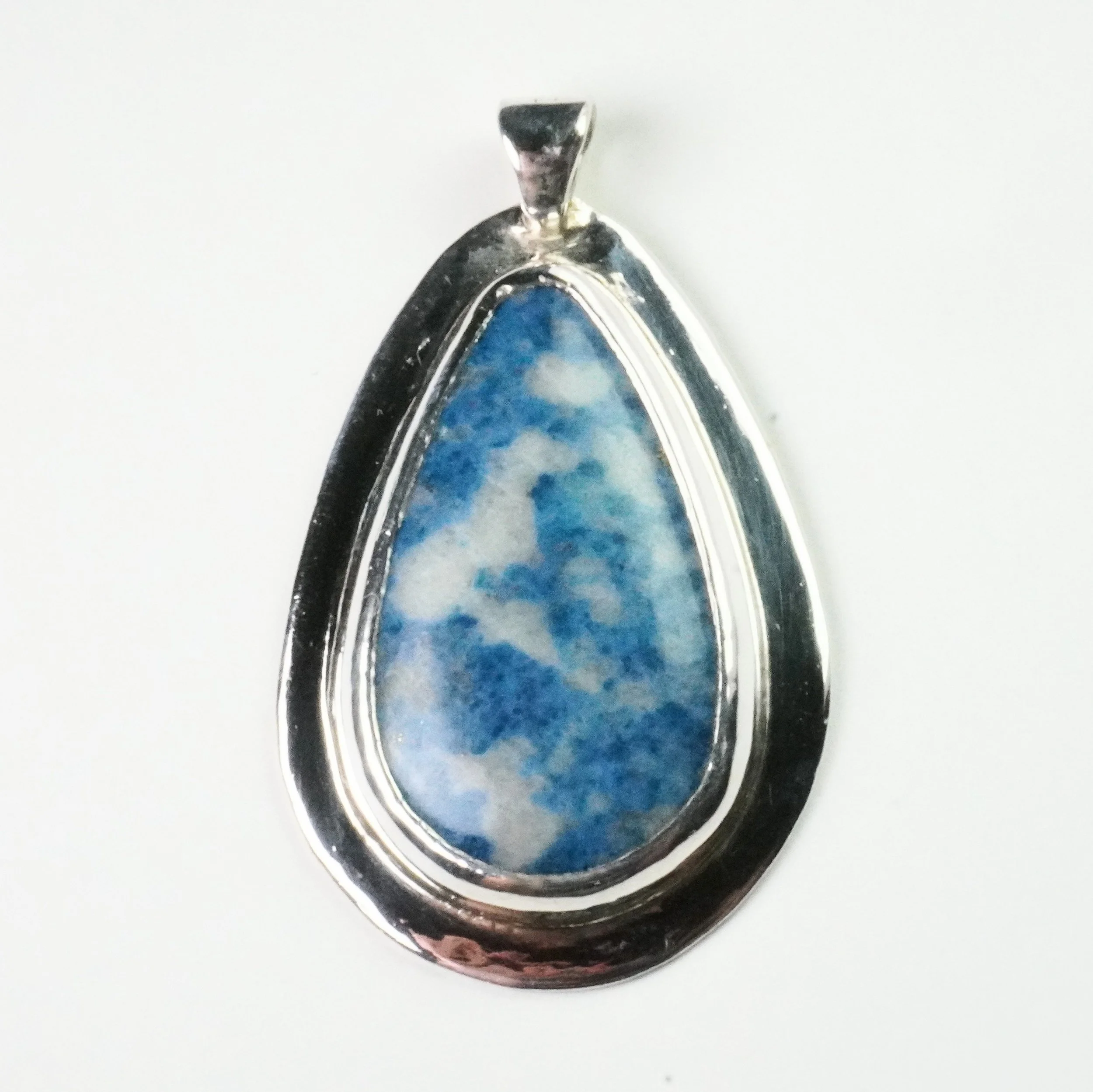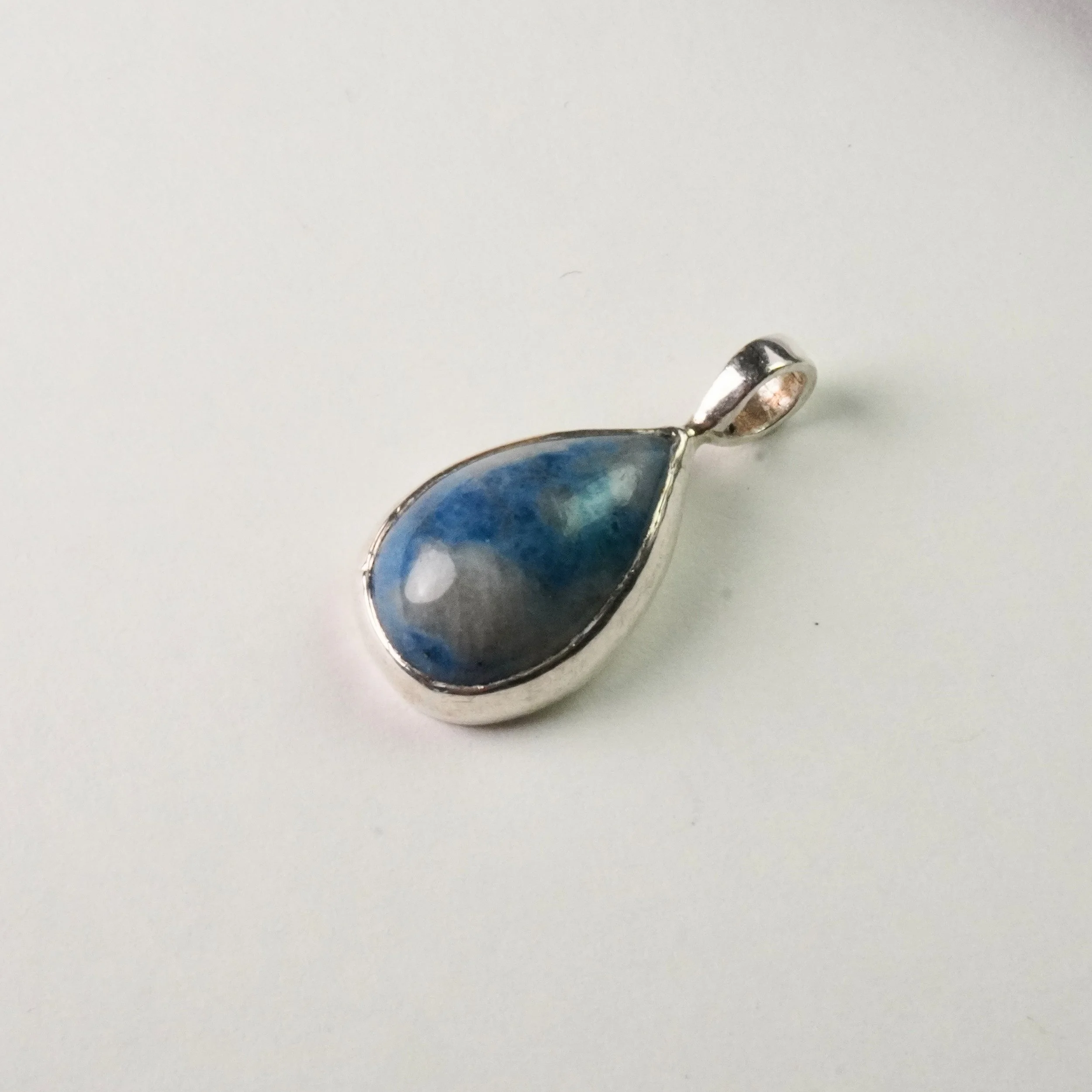 Silver pendant with a teardrop-shaped blue and gray stone on a plain white background