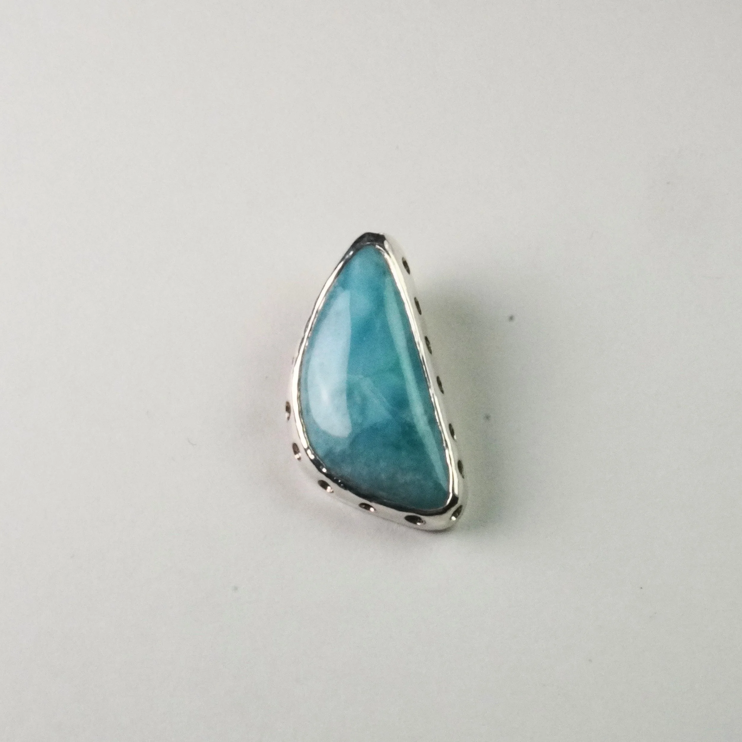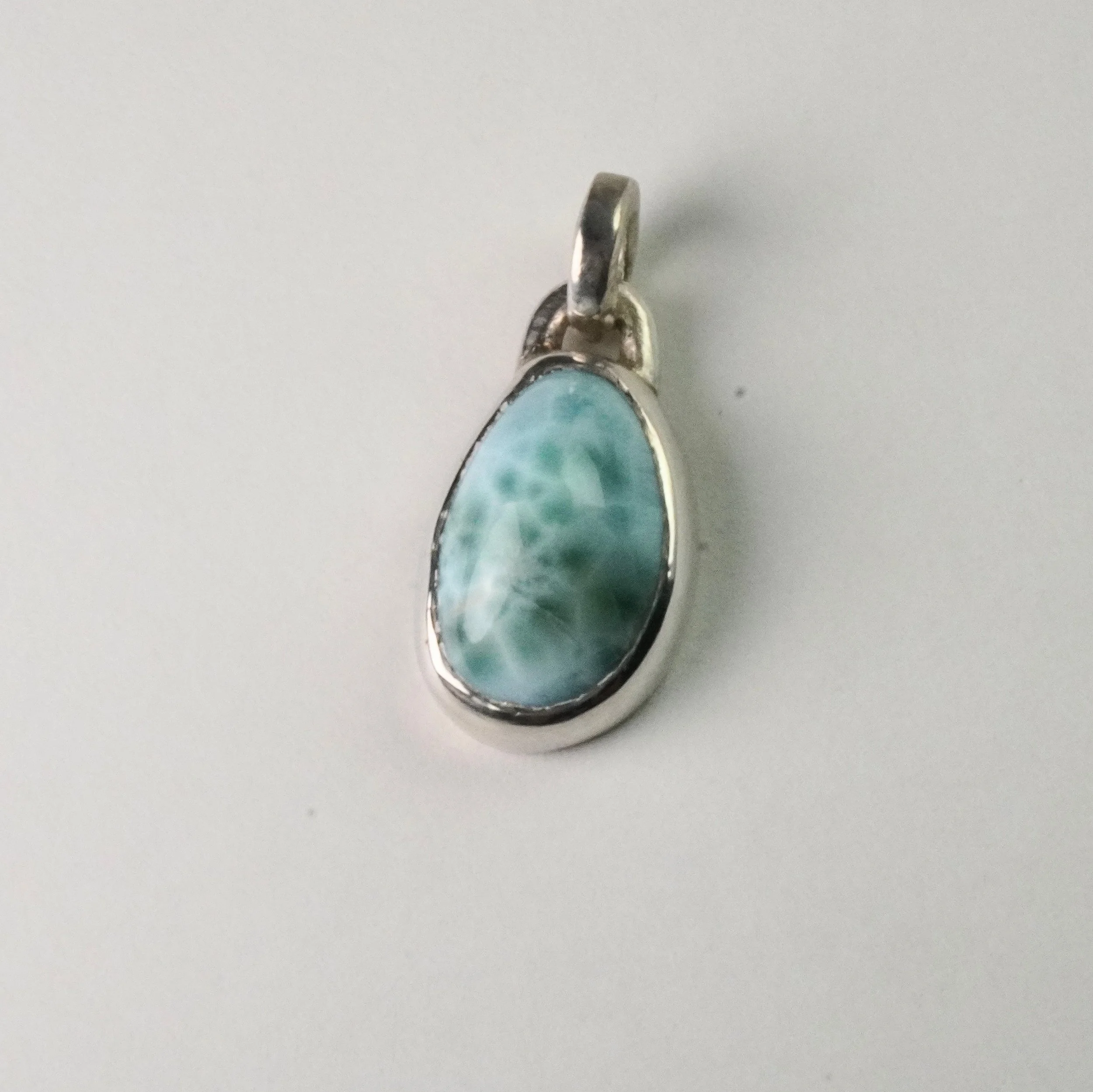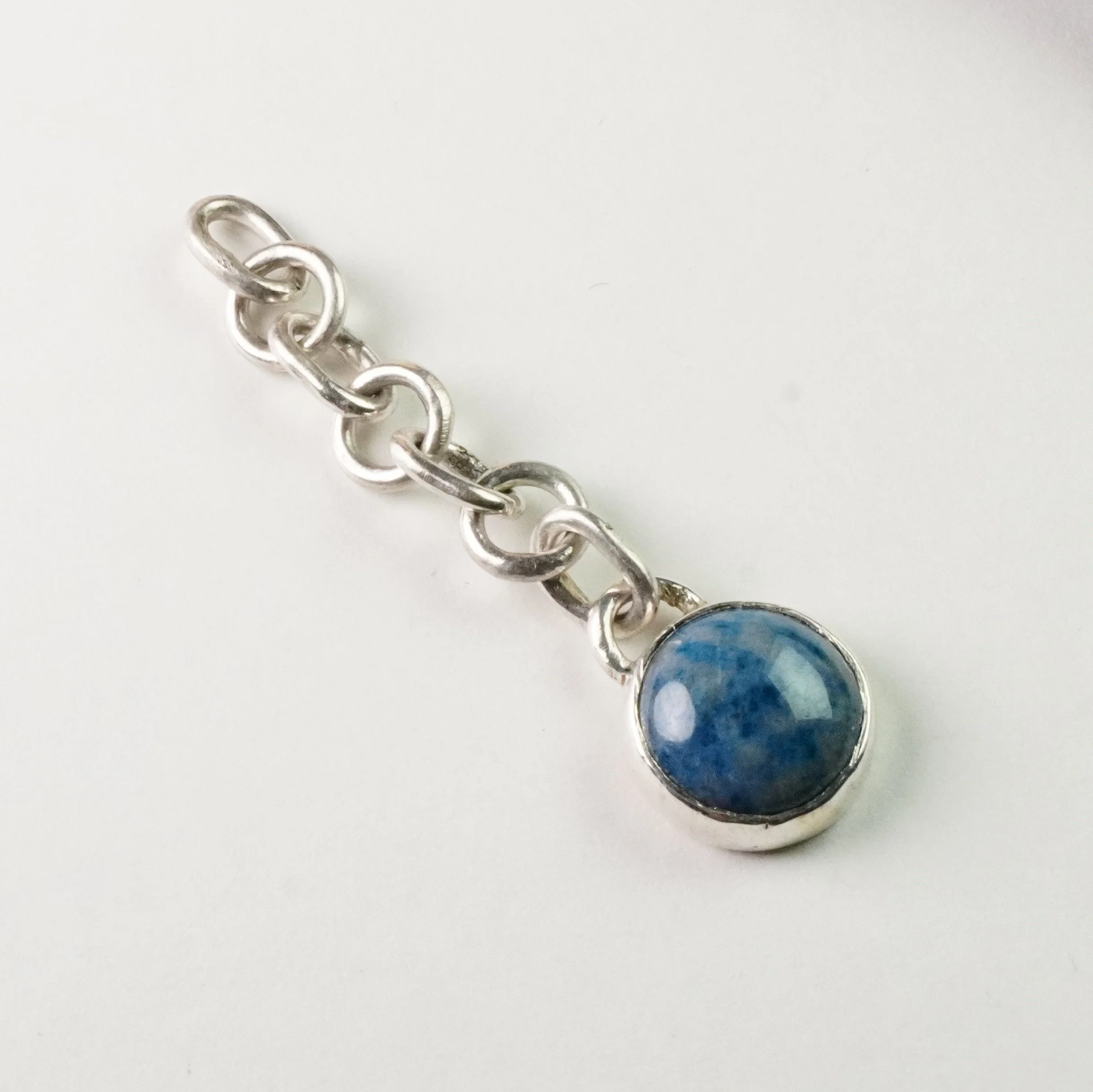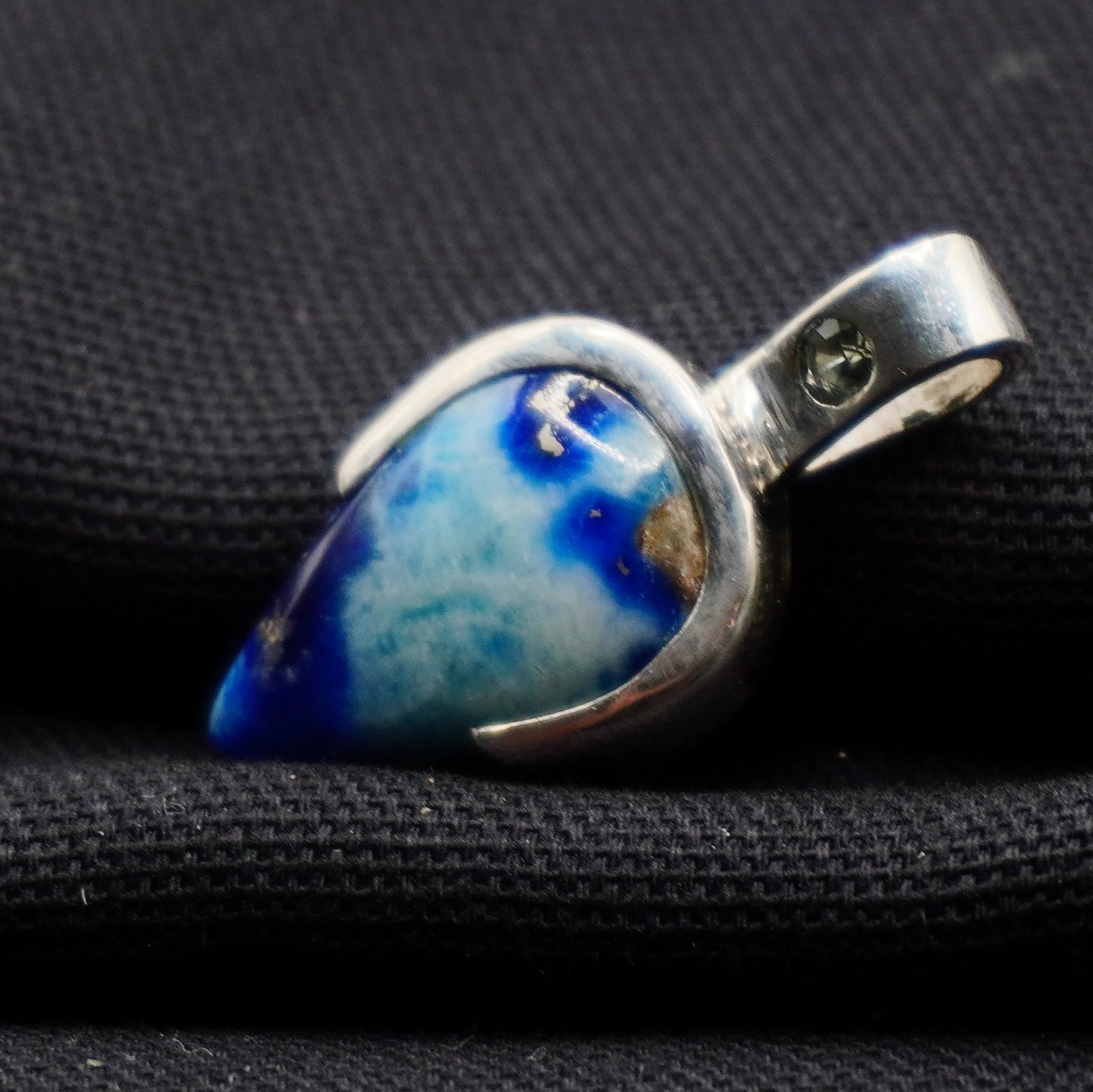 Silver pendant with a teardrop-shaped blue and gray stone on a plain white background