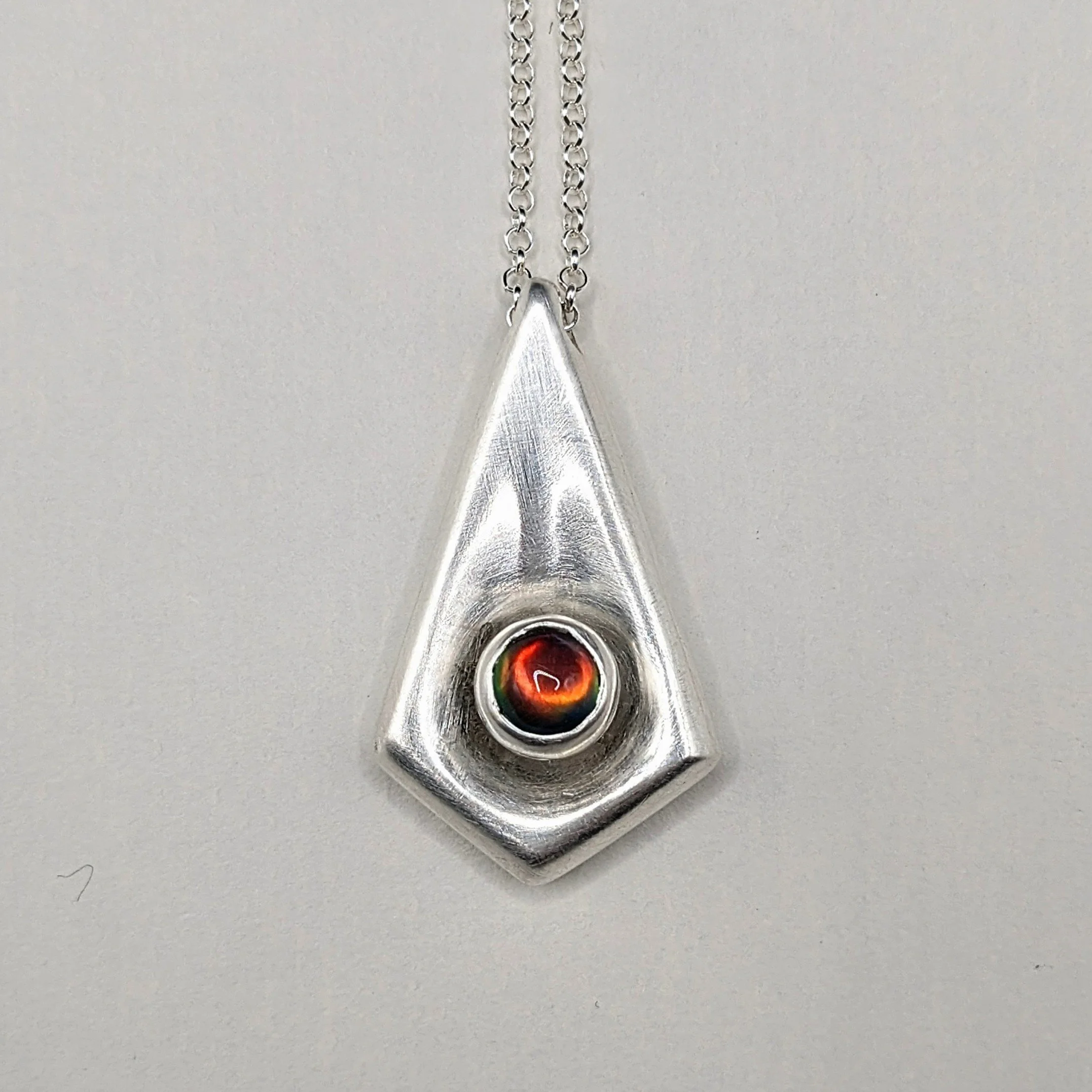 Silver necklace with a large, triangle-shaped pendant featuring a circular stone with rainbow colors.