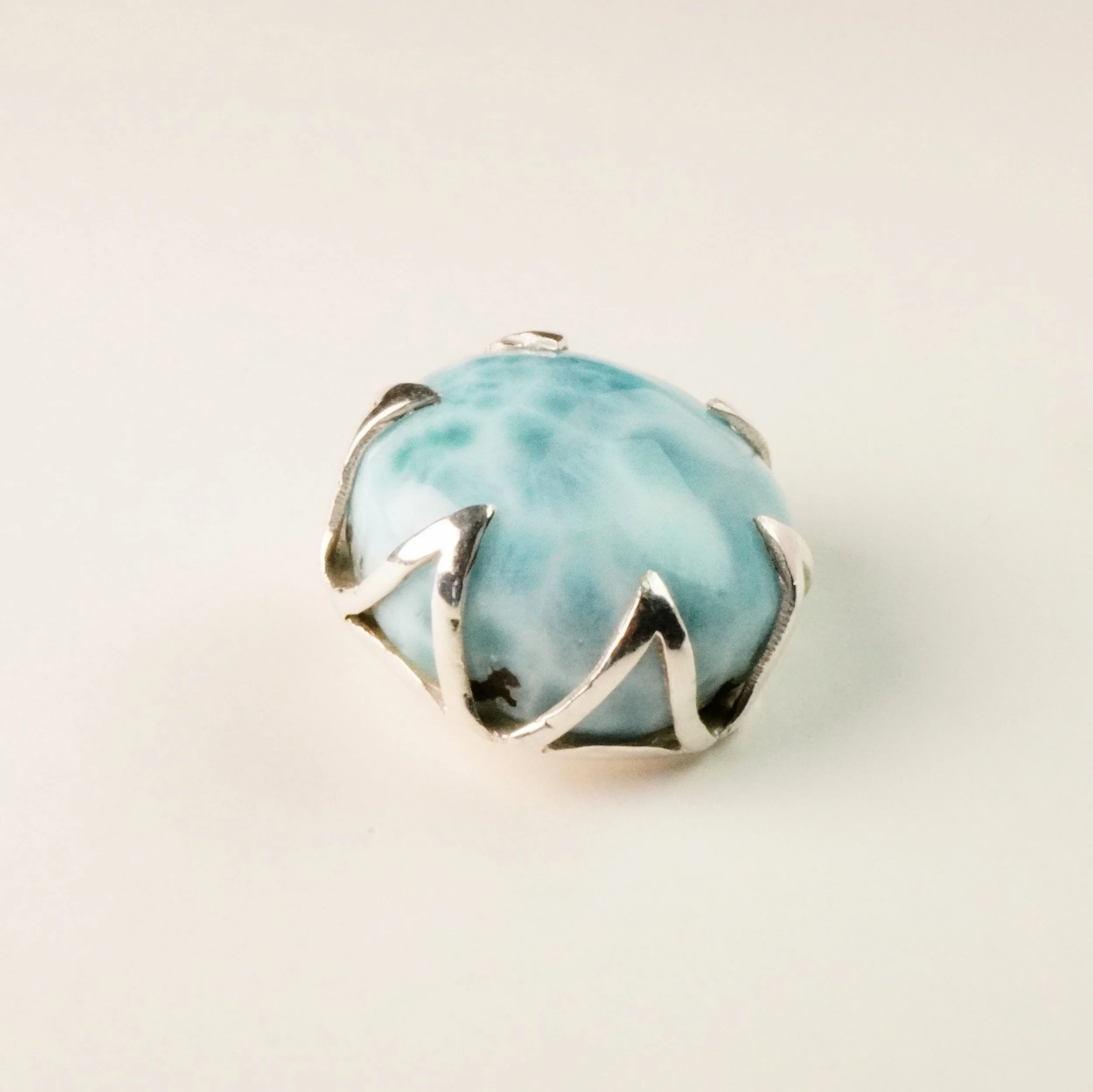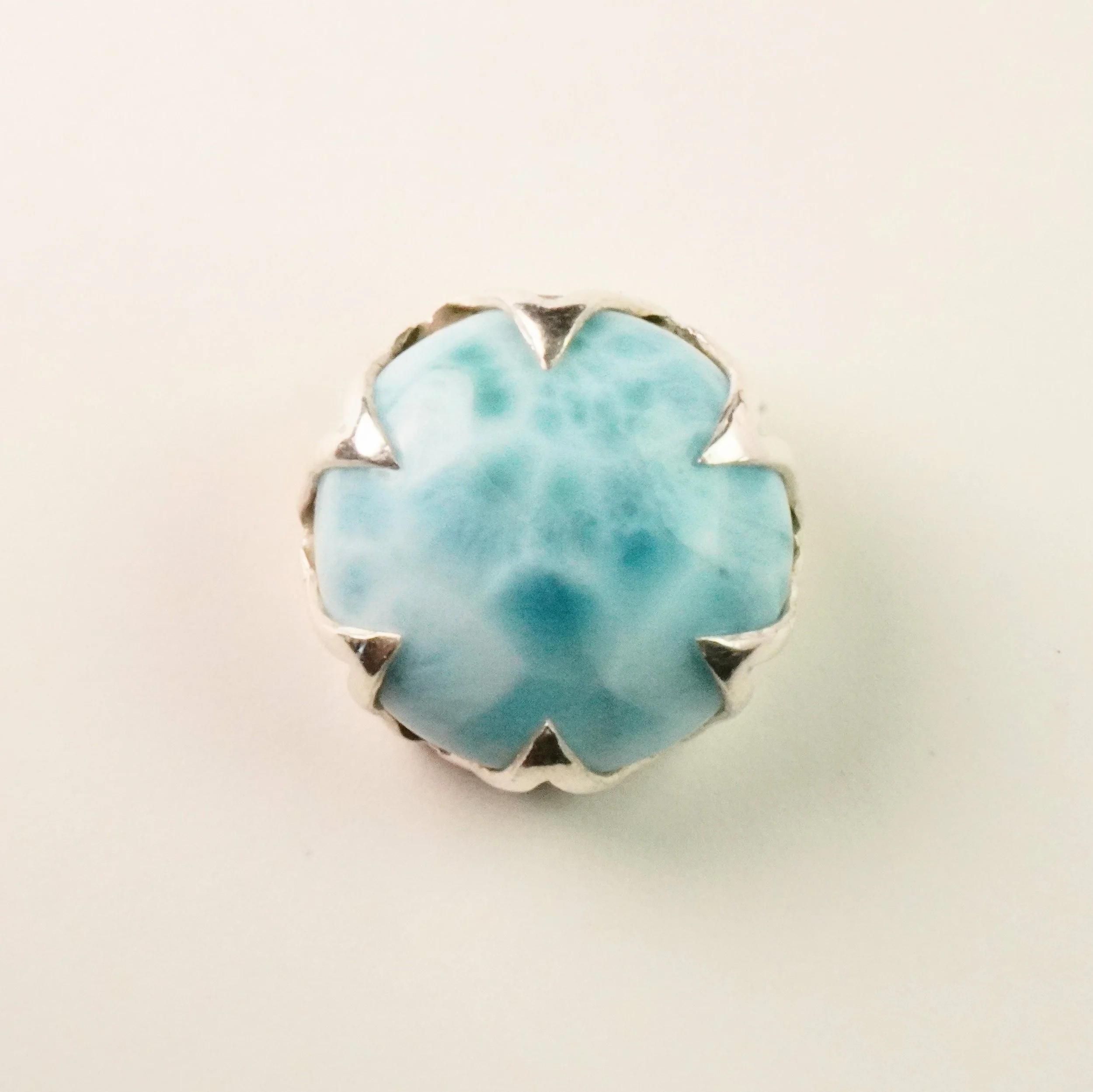 Close-up image of a ring with a large, light blue, flower-shaped stone set in a silver band.