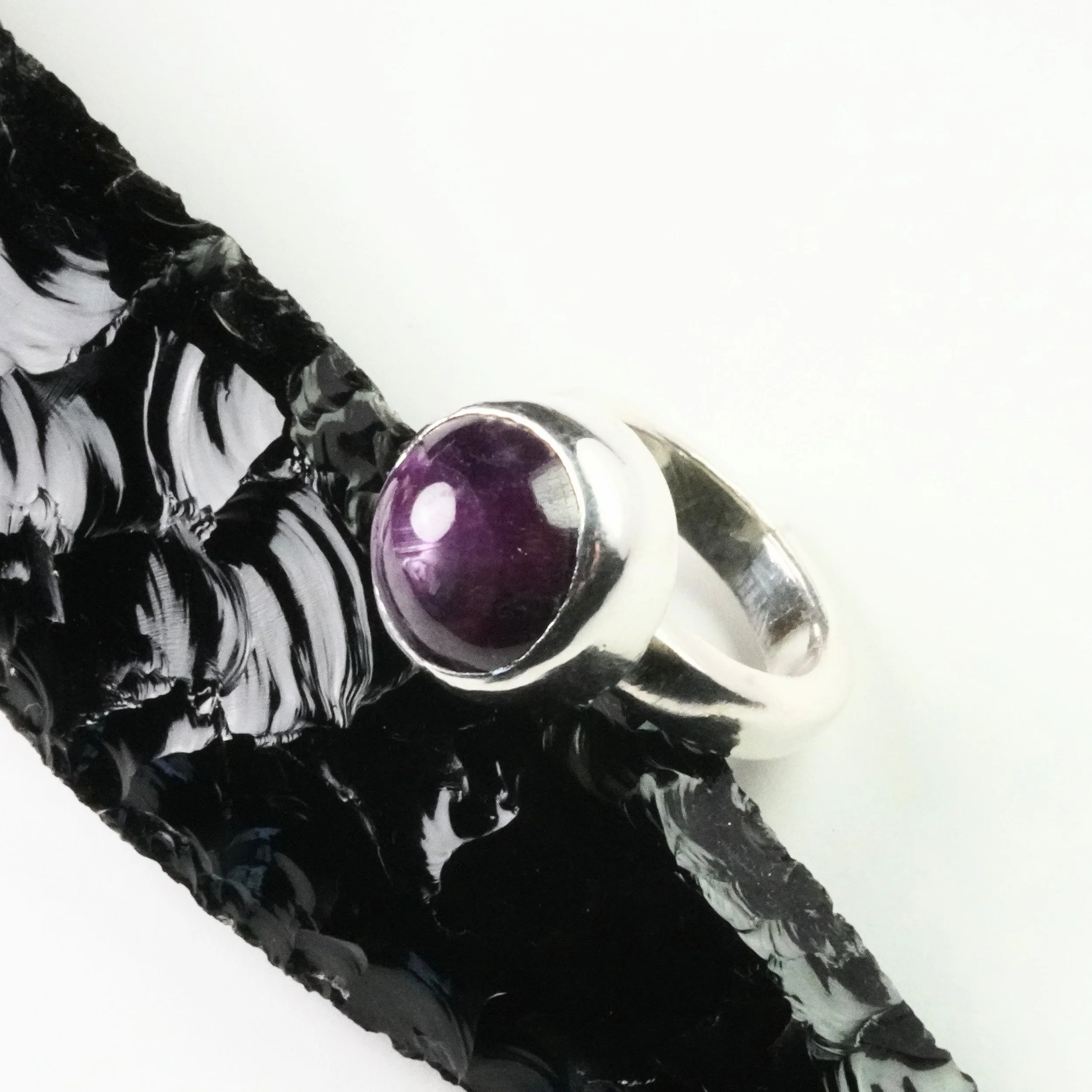A silver ring with a large, dark gemstone set in a bezel setting, resting on a white, textured sculpture or object.