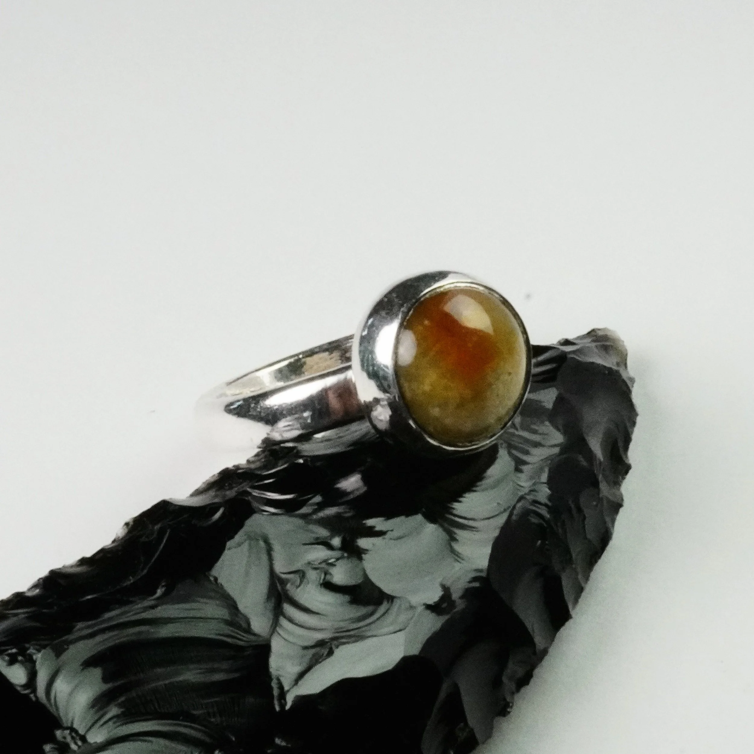 Silver ring with round yellowish-brown stone resting on a crumpled black foil or paper.