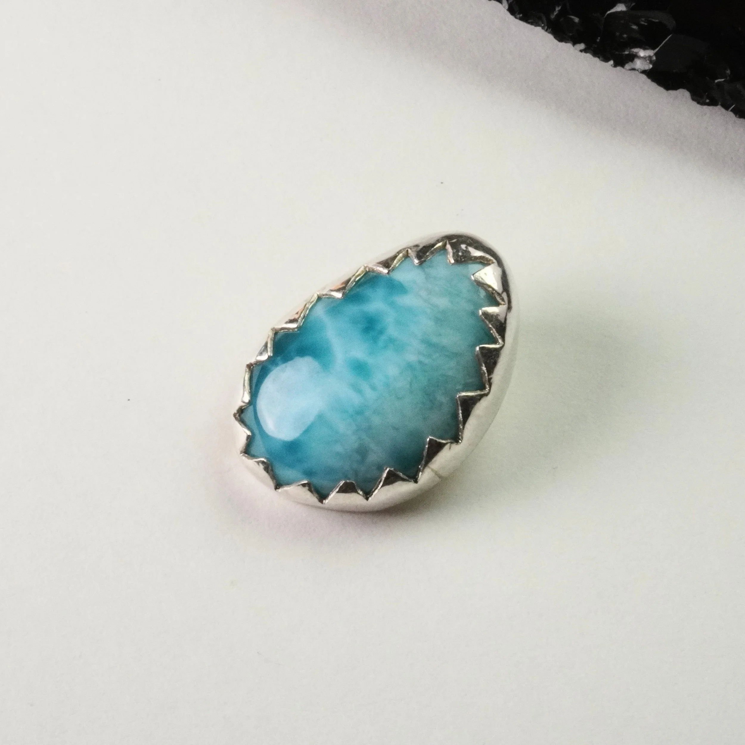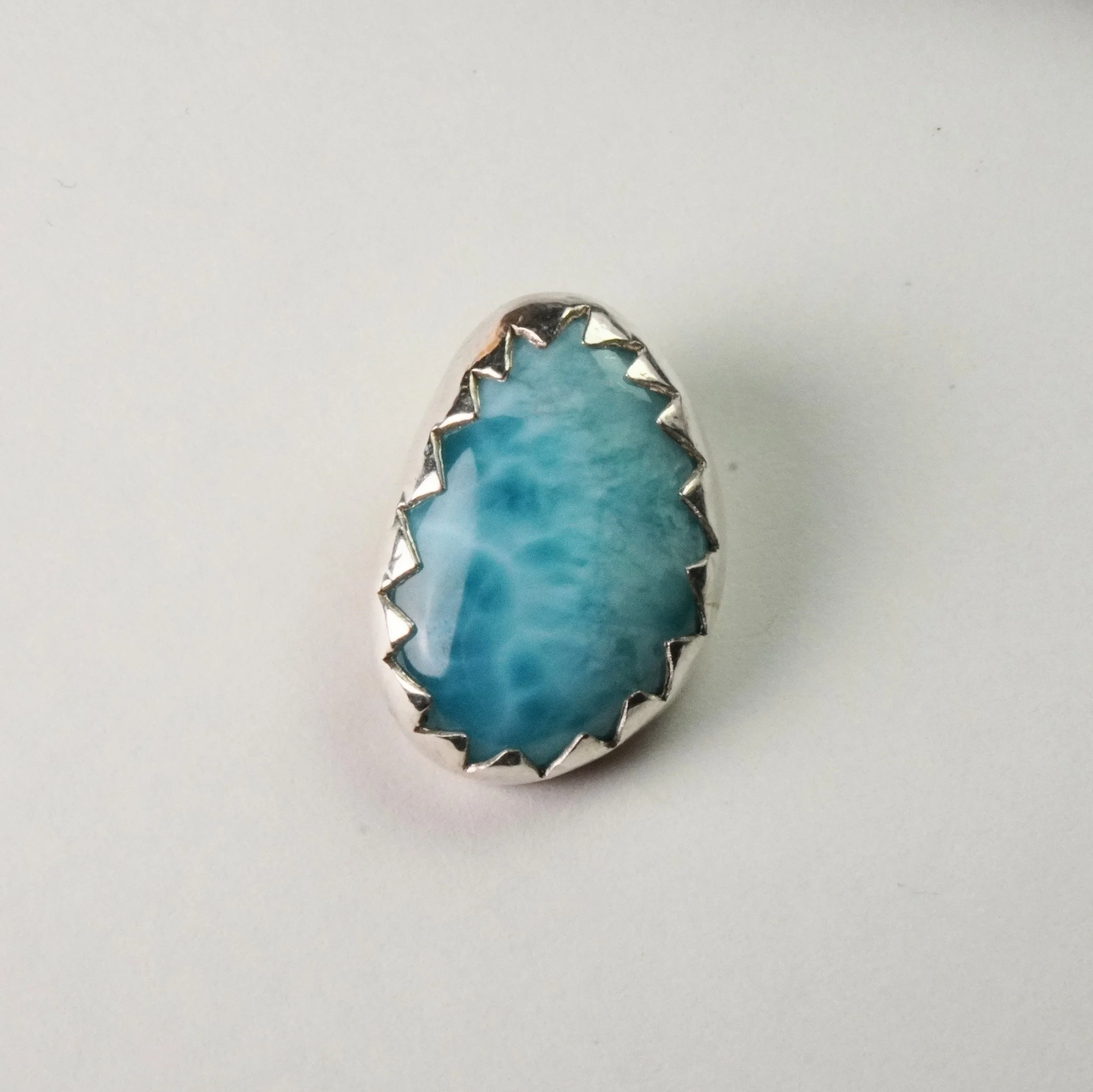 A silver ring with a large oval blue gemstone set in a jagged bezel setting.
