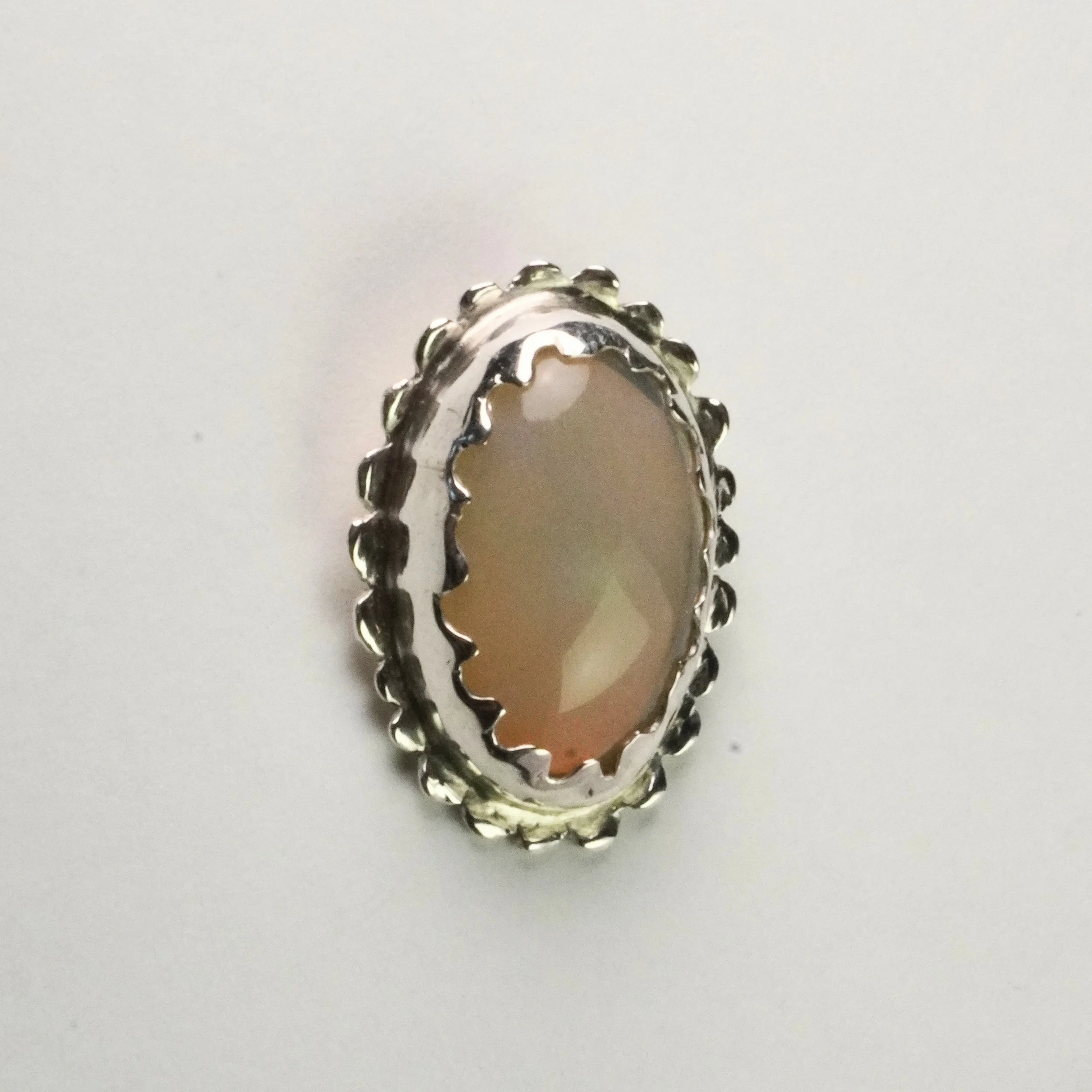 A silver ring with an oval-shaped, reflective gemstone set in the center on a white background.