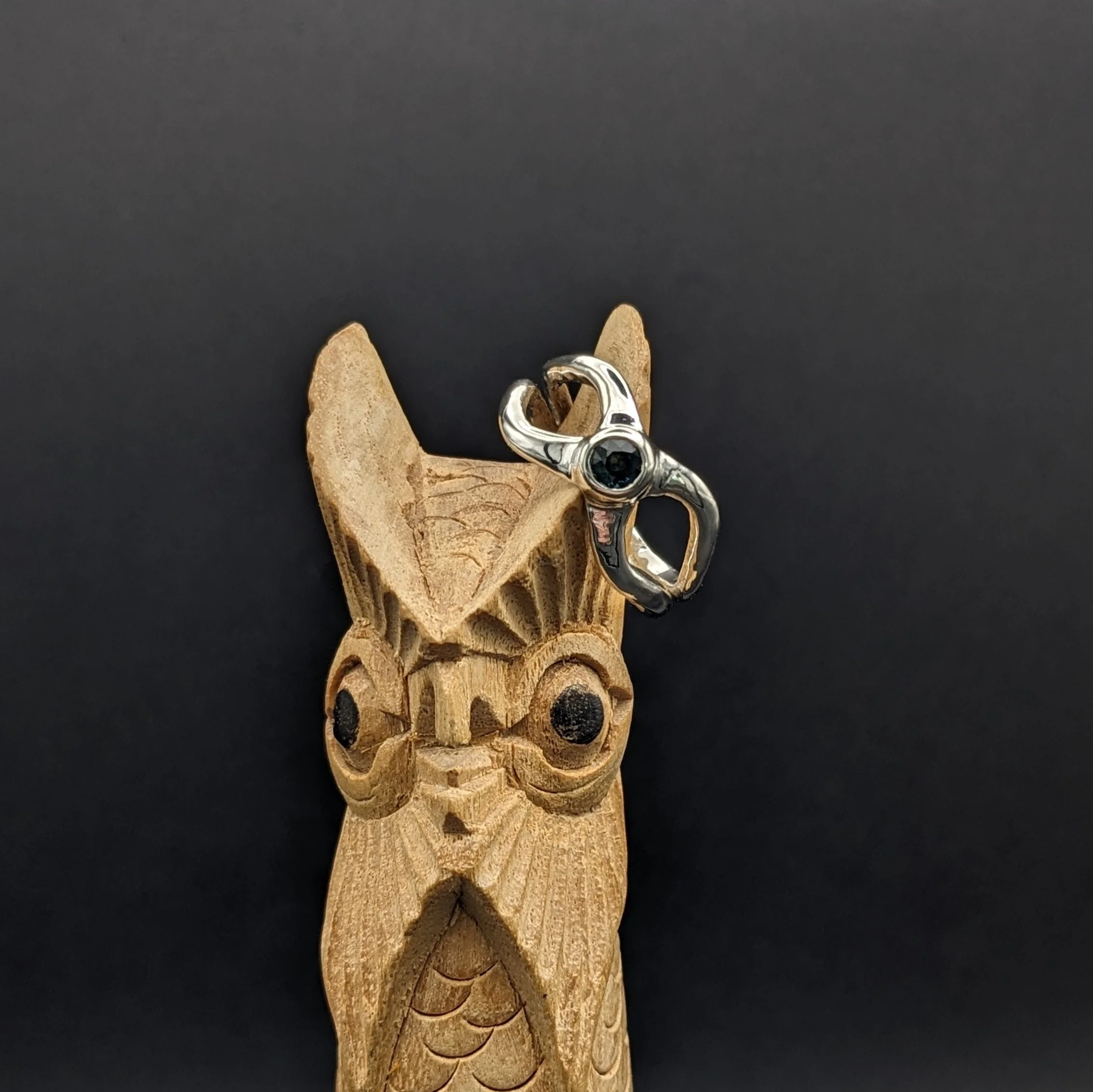 A silver ring with a bow-like design and a central black gemstone on a dark background.