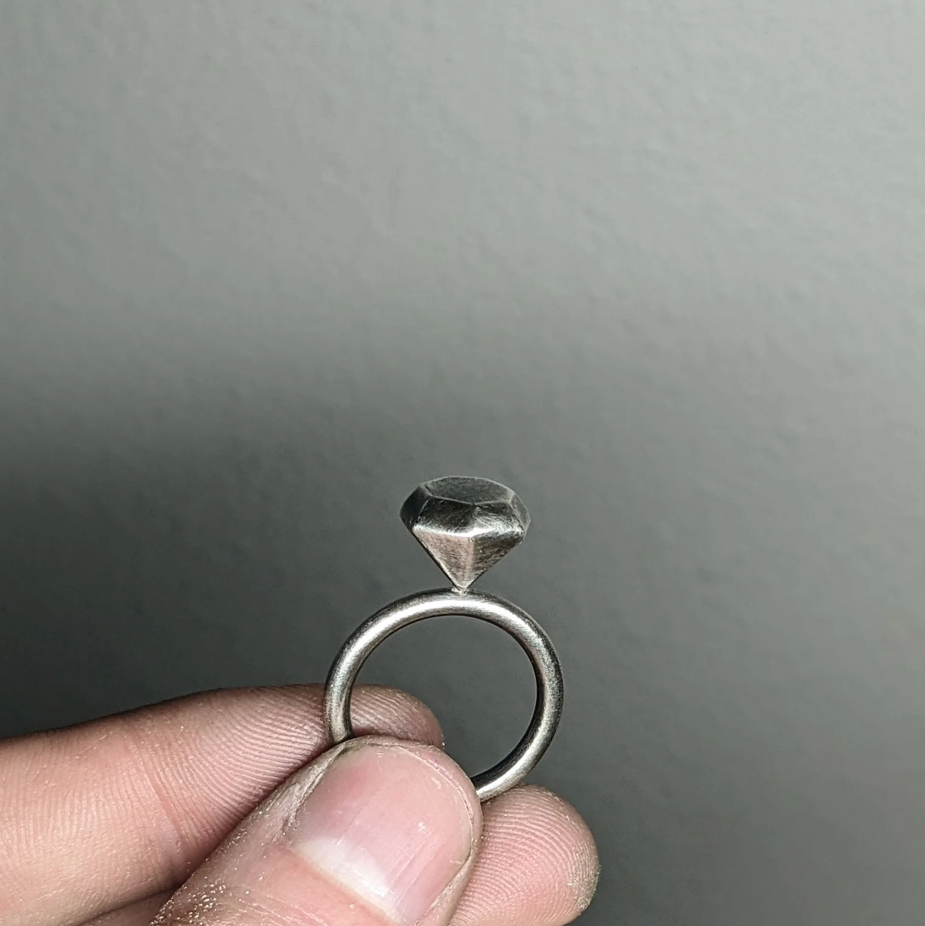Person holding a silver ring with a large, faceted diamond-shaped top, resembling a modern, industrial-style ring.