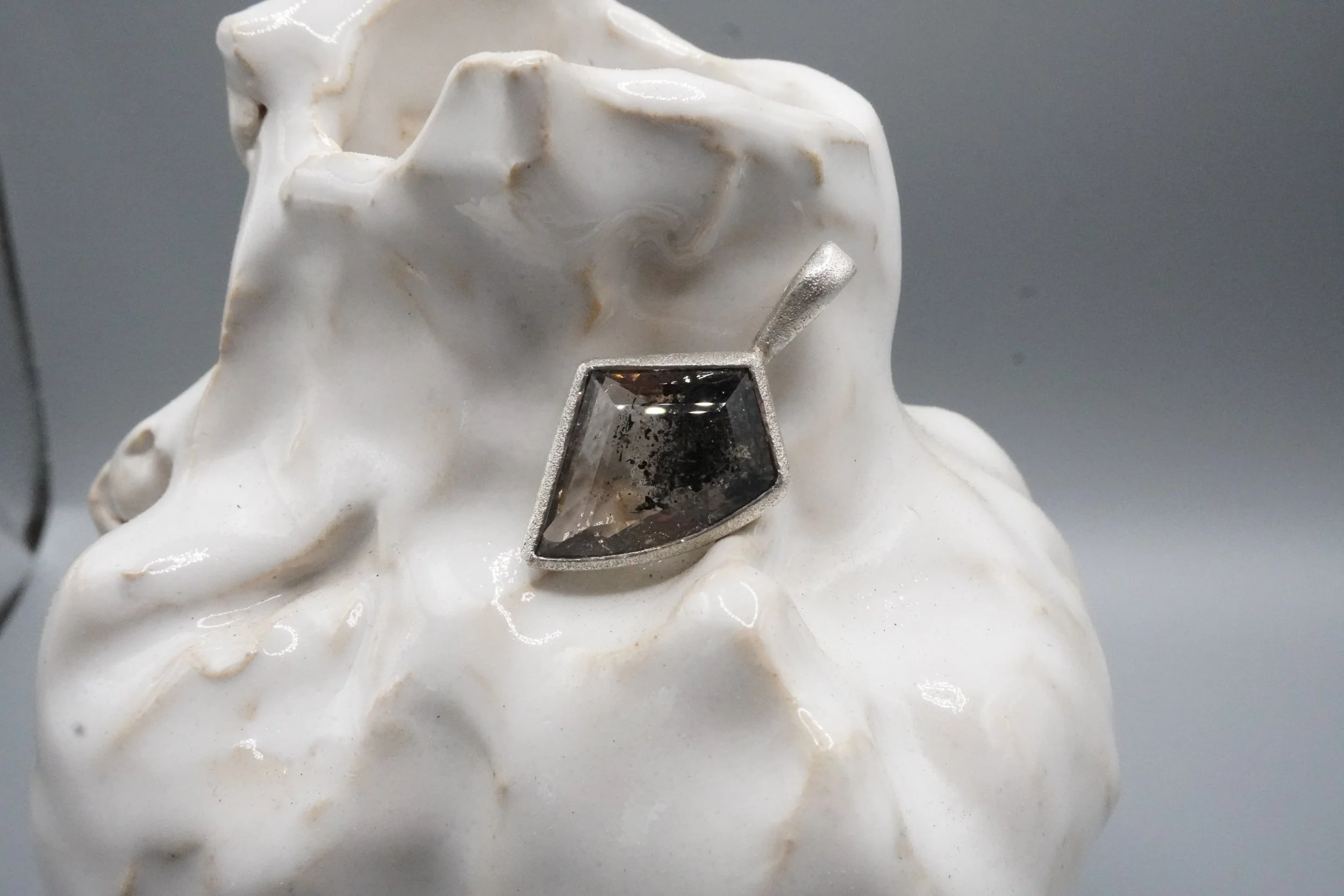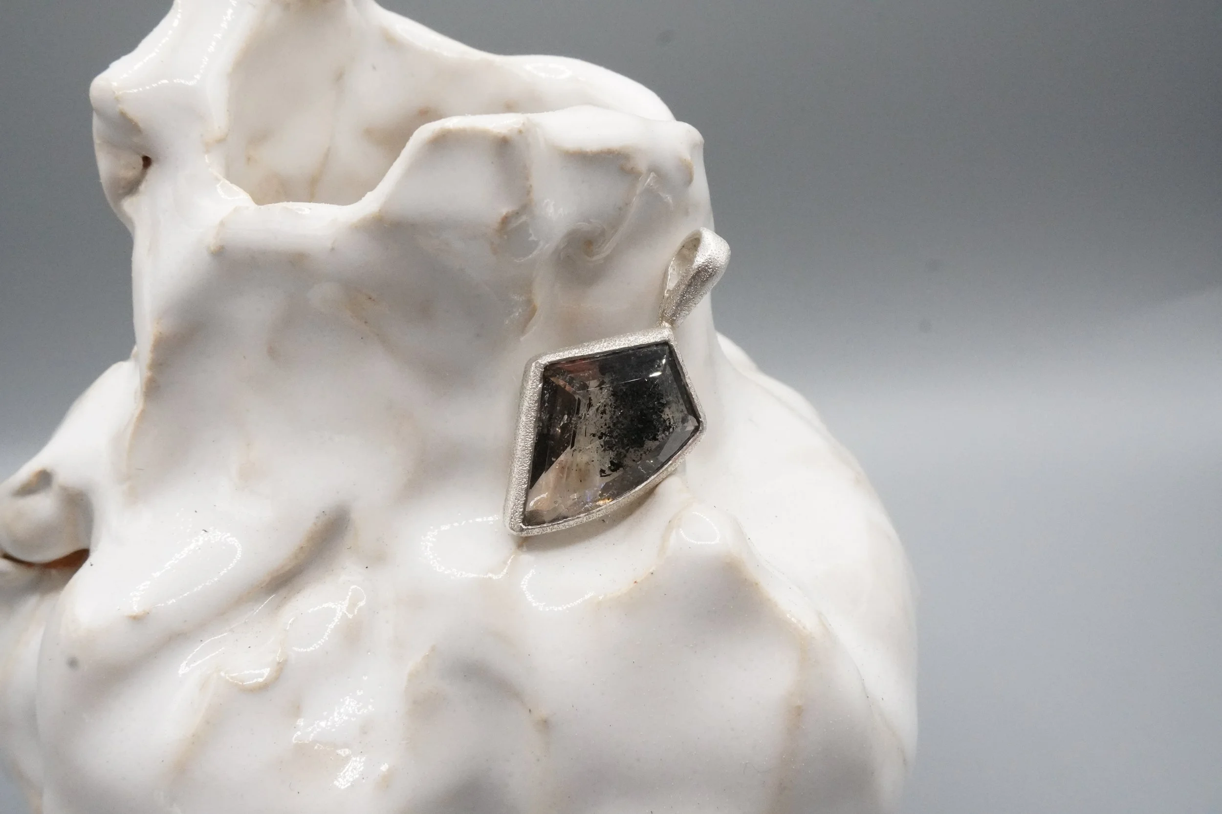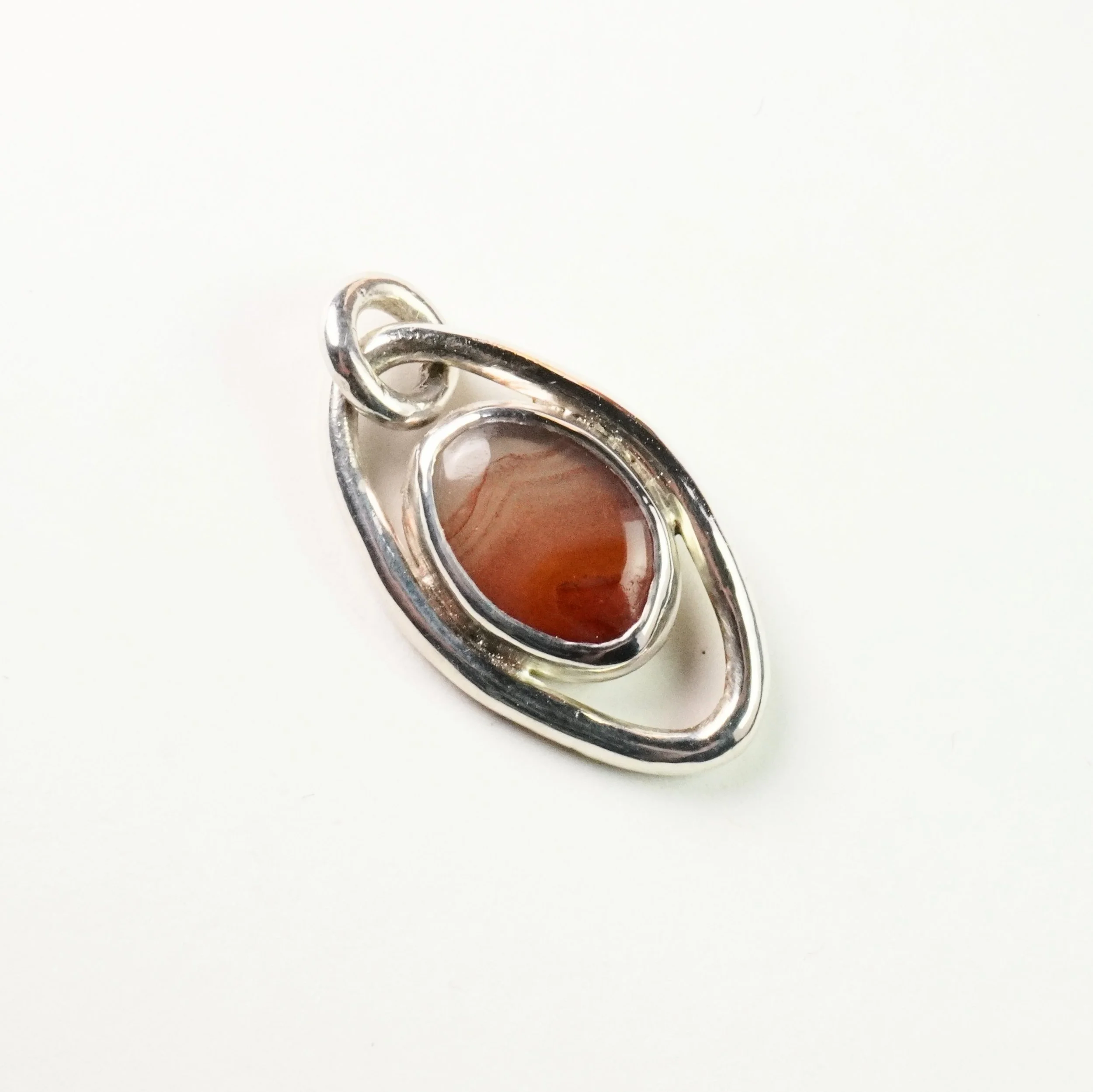 Silver pendant with a small, round, iridescent gemstone, hanging from a silver loop and attached to a dark metallic object.