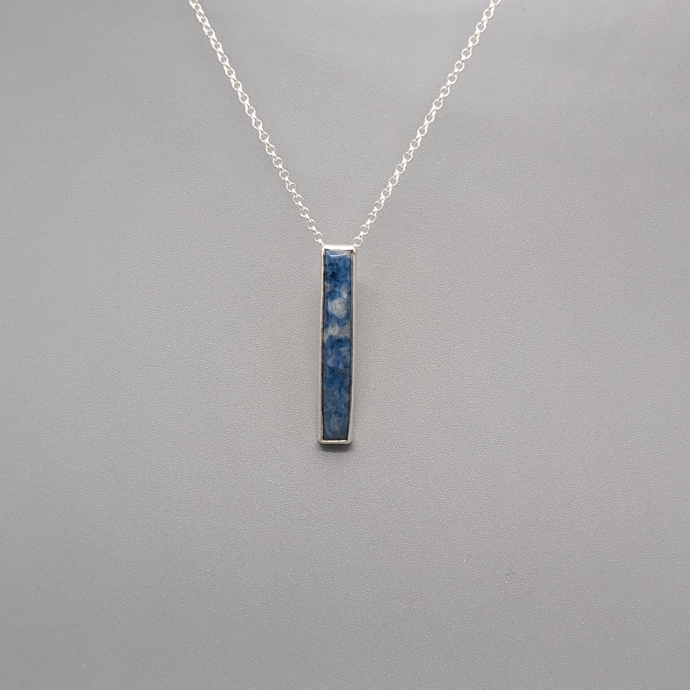 Silver necklace with a rectangular blue stone pendant on a gray background.