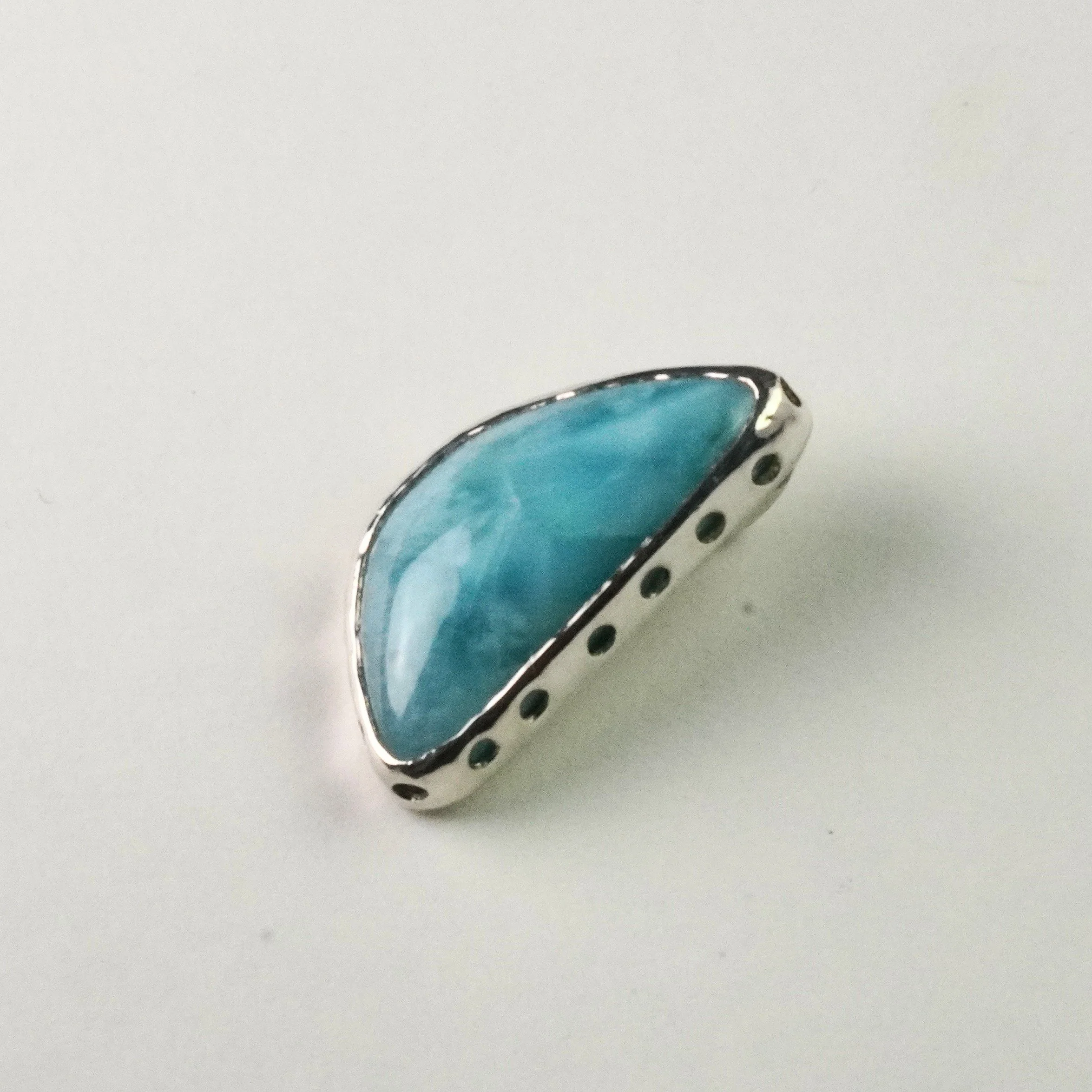 A silver teardrop-shaped necklace with a blue and white stone pendant, held between someone's fingers.
