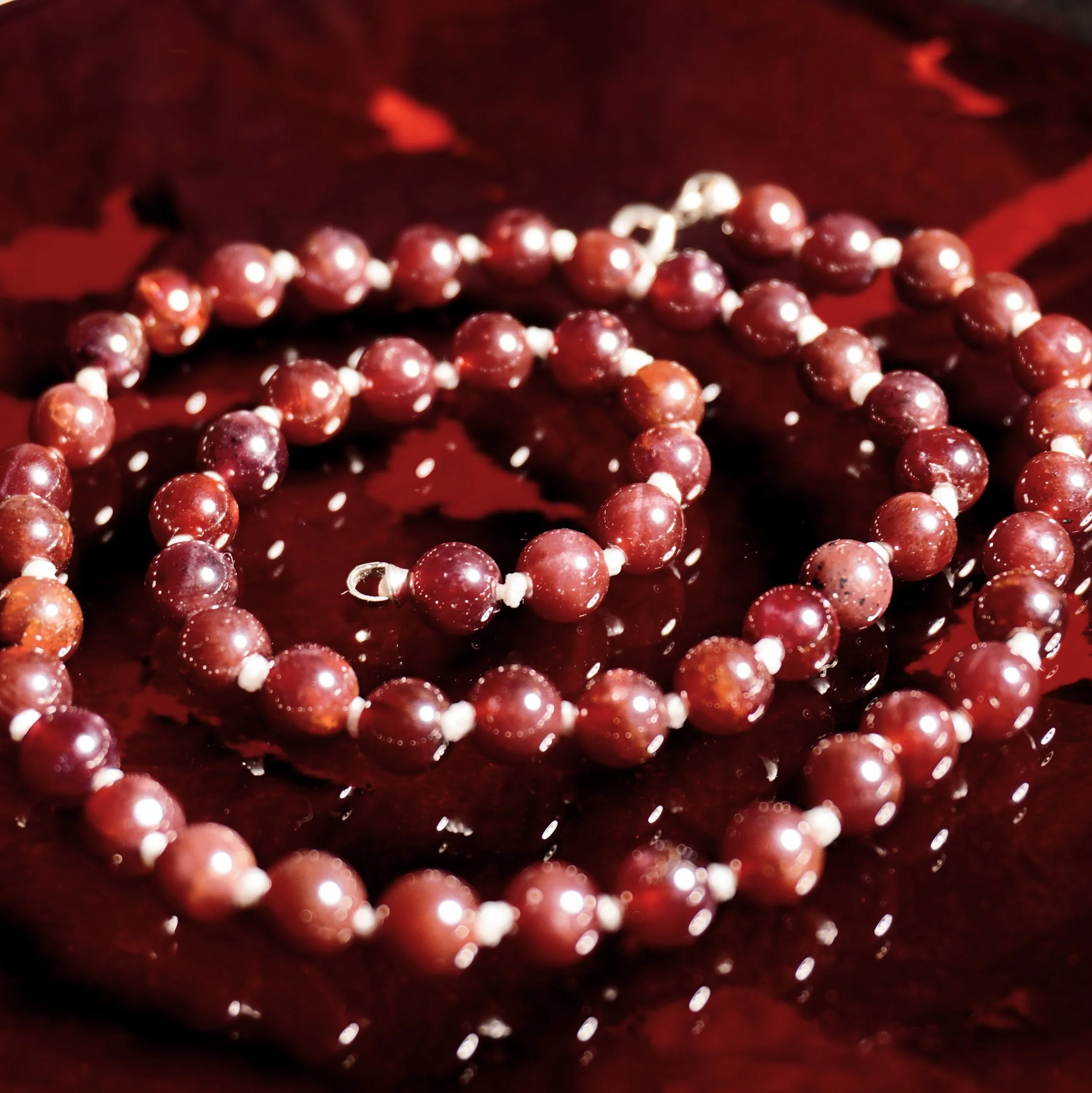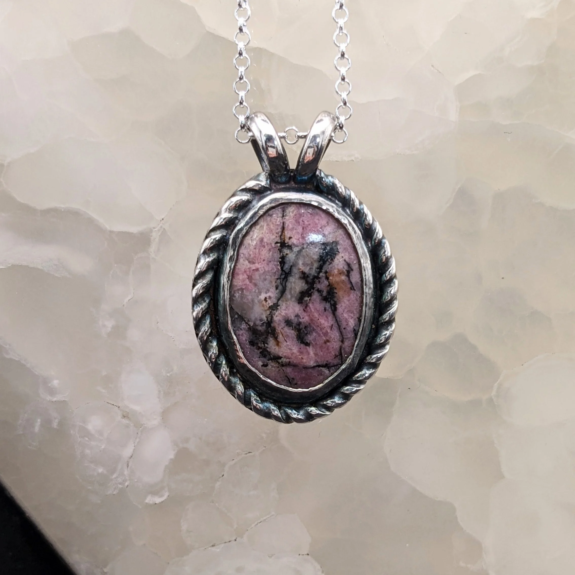 Silver necklace with an oval pendant containing a pink, black, and gray stone.