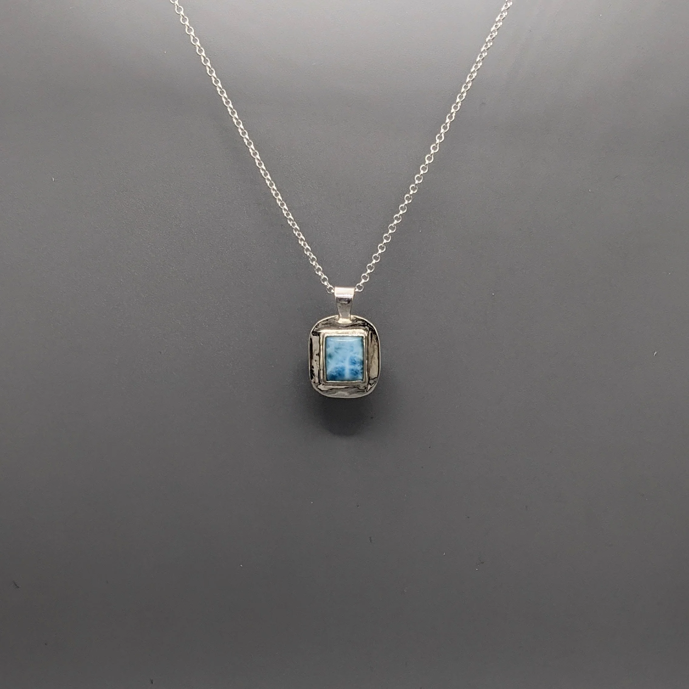 Silver necklace with a rectangular pendant featuring a blue gemstone, displayed on a grey background.