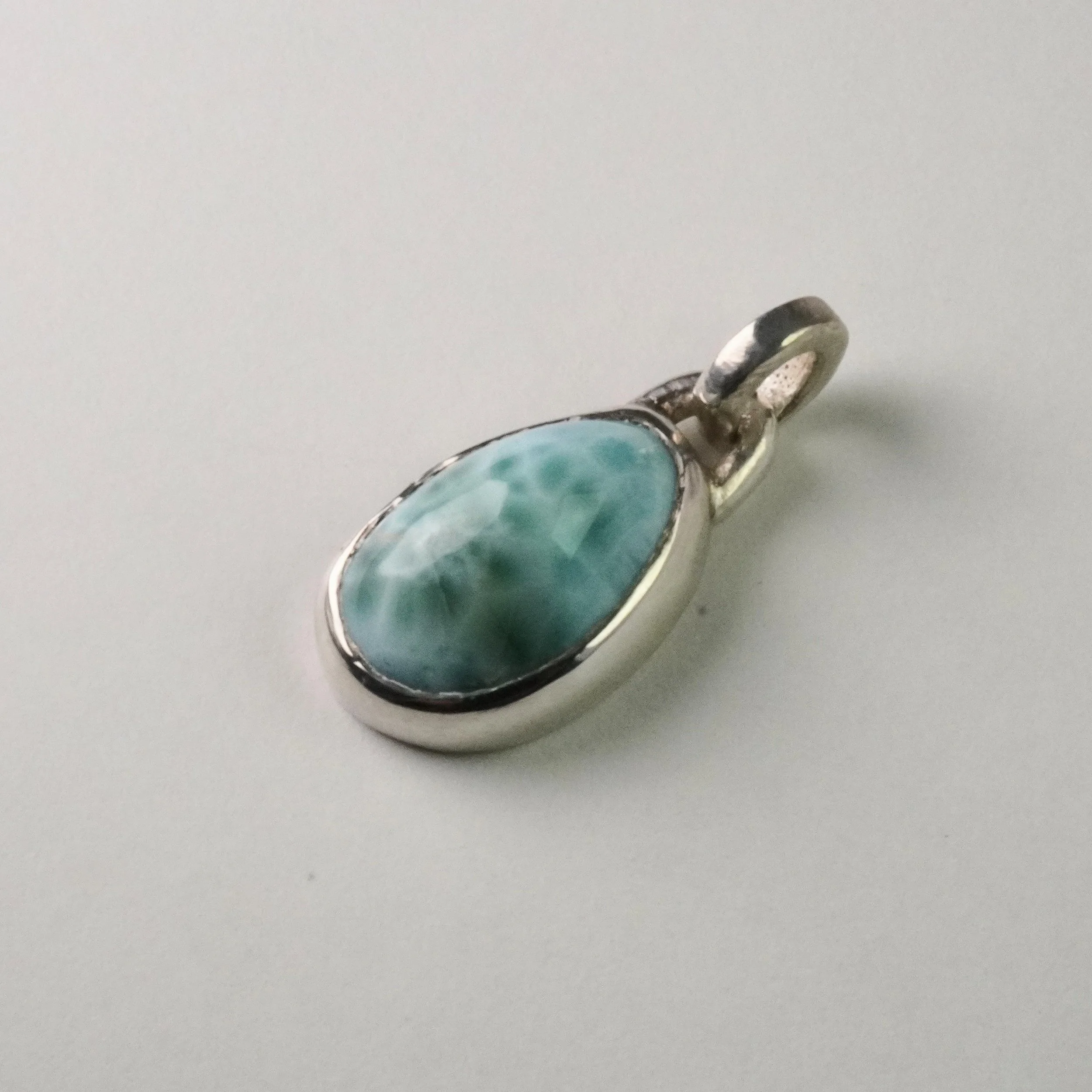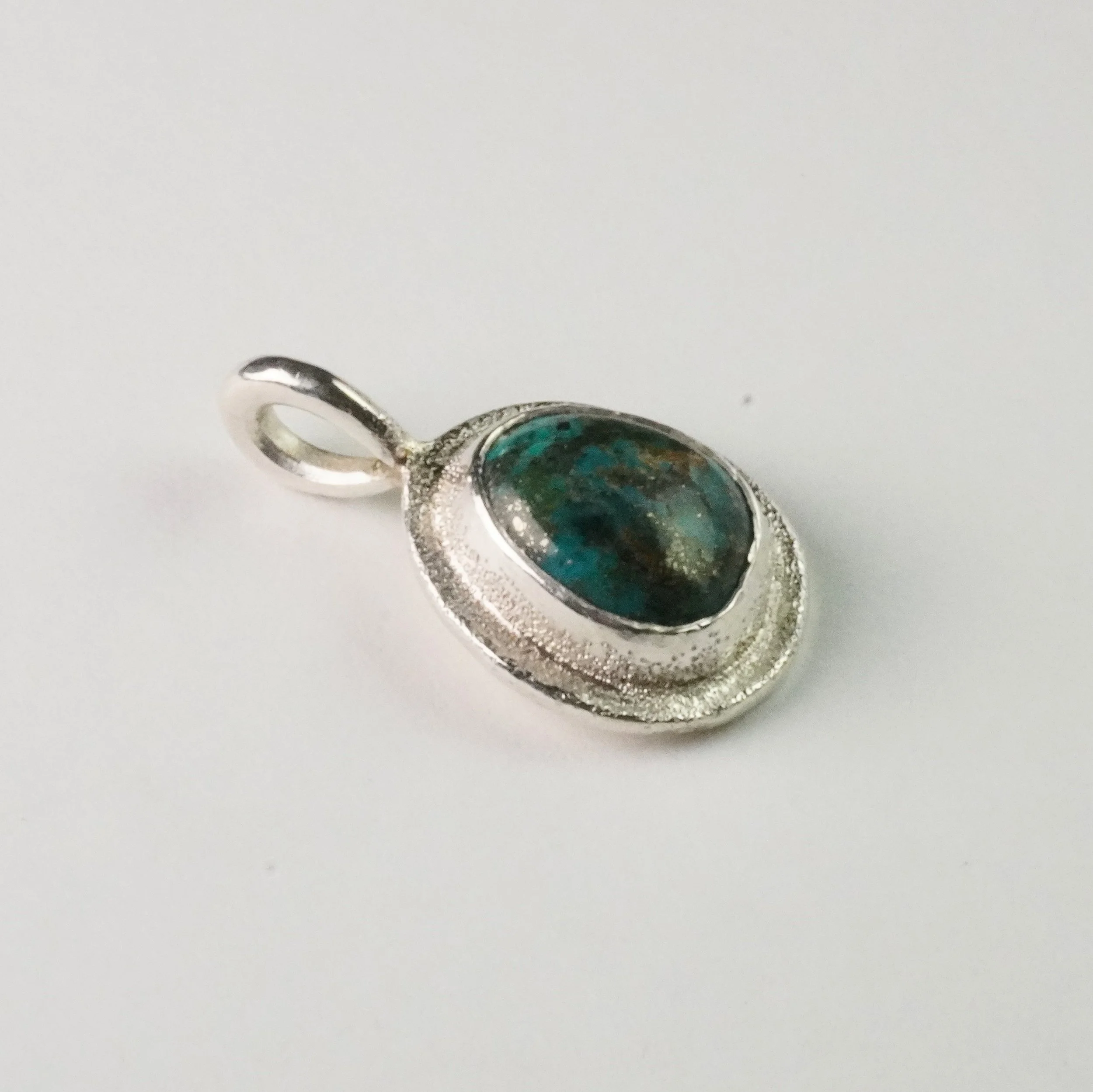 A silver pendant with an oval-shaped turquoise gemstone on a plain, light-colored background.