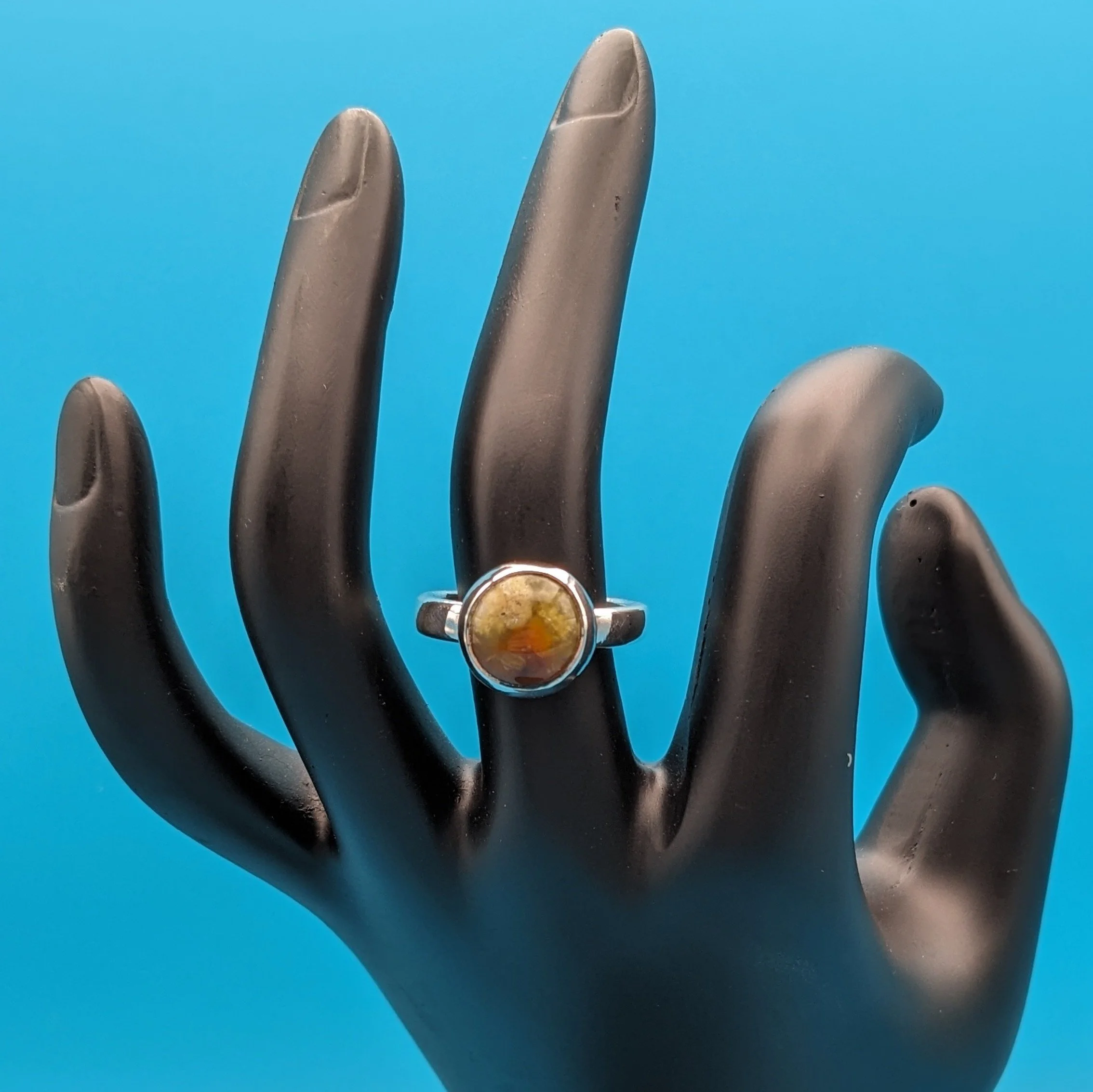 Silver ring with an oval amber stone on a black mannequin hand against a blue background.