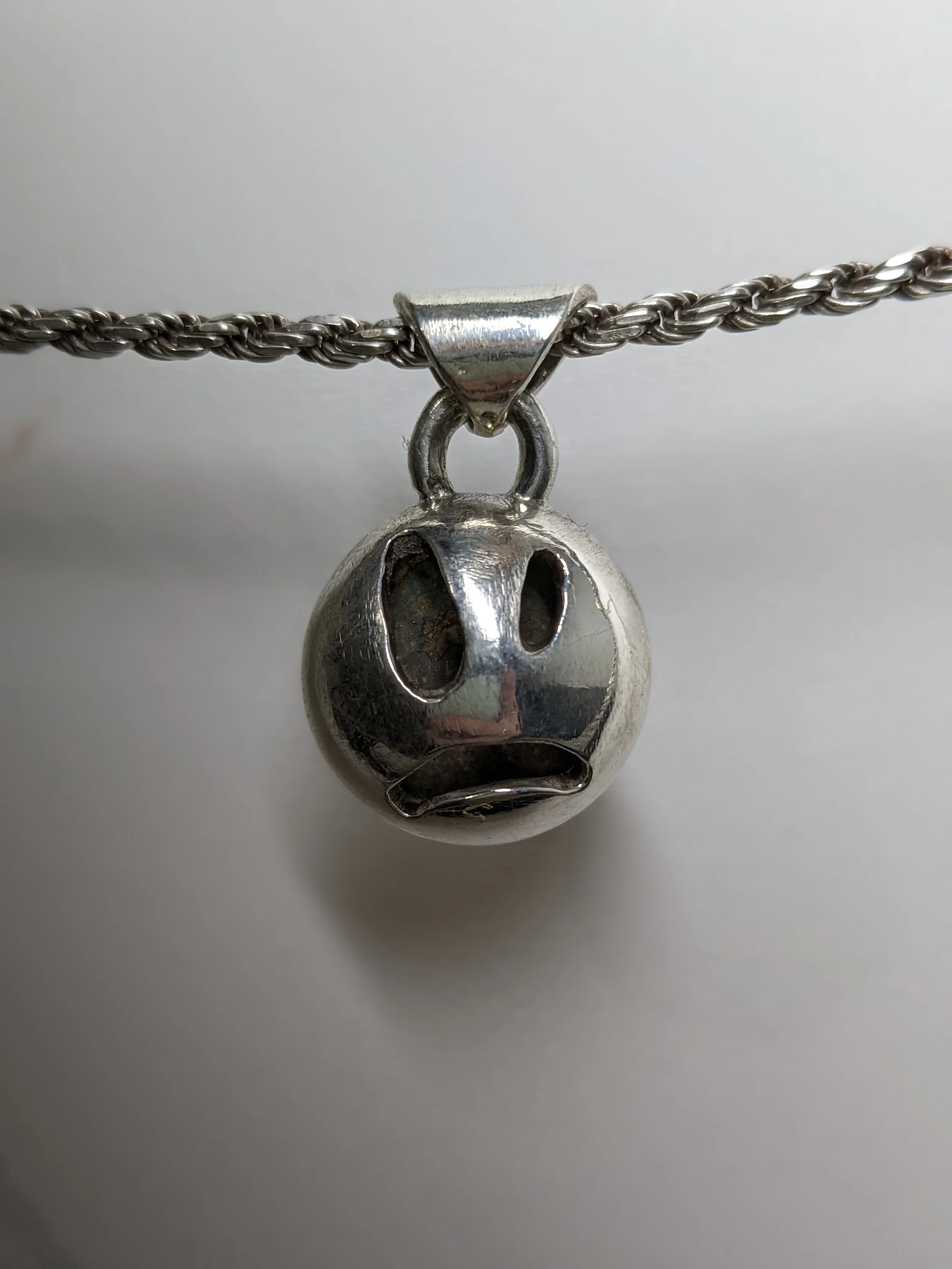 A silver necklace with a pendant shaped like a sad faced ghost or skull hanging from a twisted silver chain.