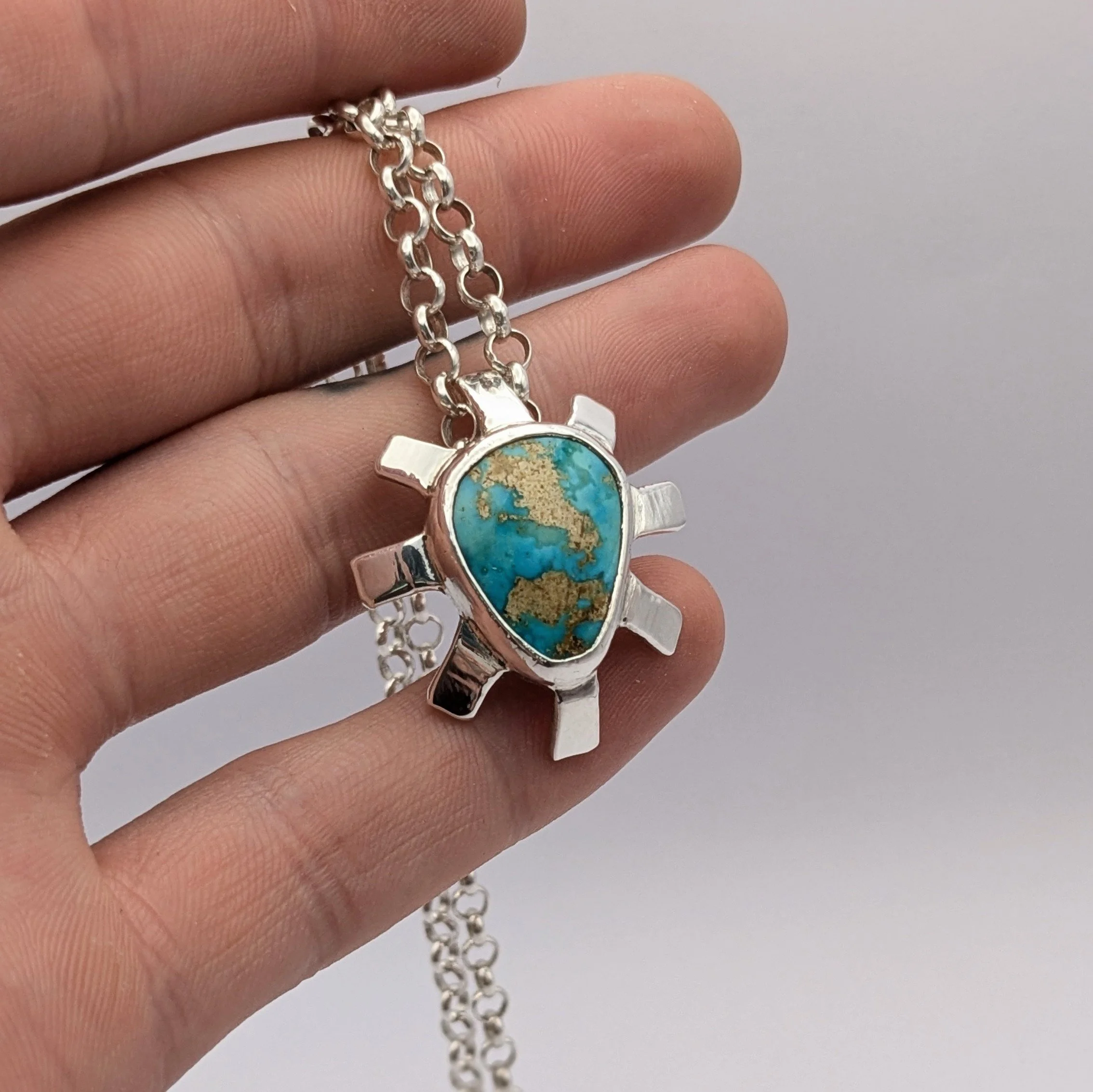 Silver necklace with a turtle-shaped pendant featuring a turquoise and gold-colored stone.