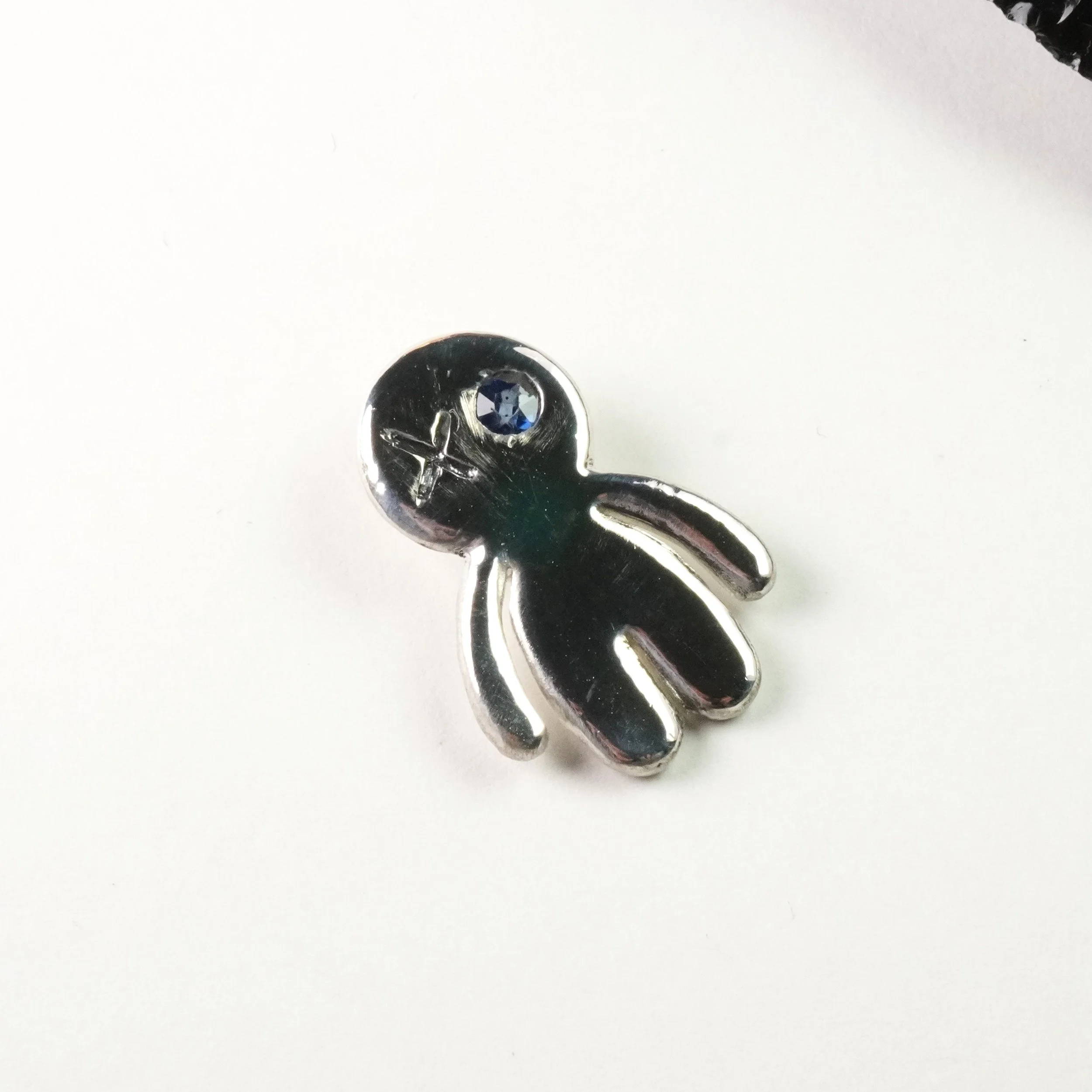 A silver pin shaped like a teddy bear with a small blue gemstone eye and a cross engraved on its head, placed on a white surface near a black and white floral-patterned object.