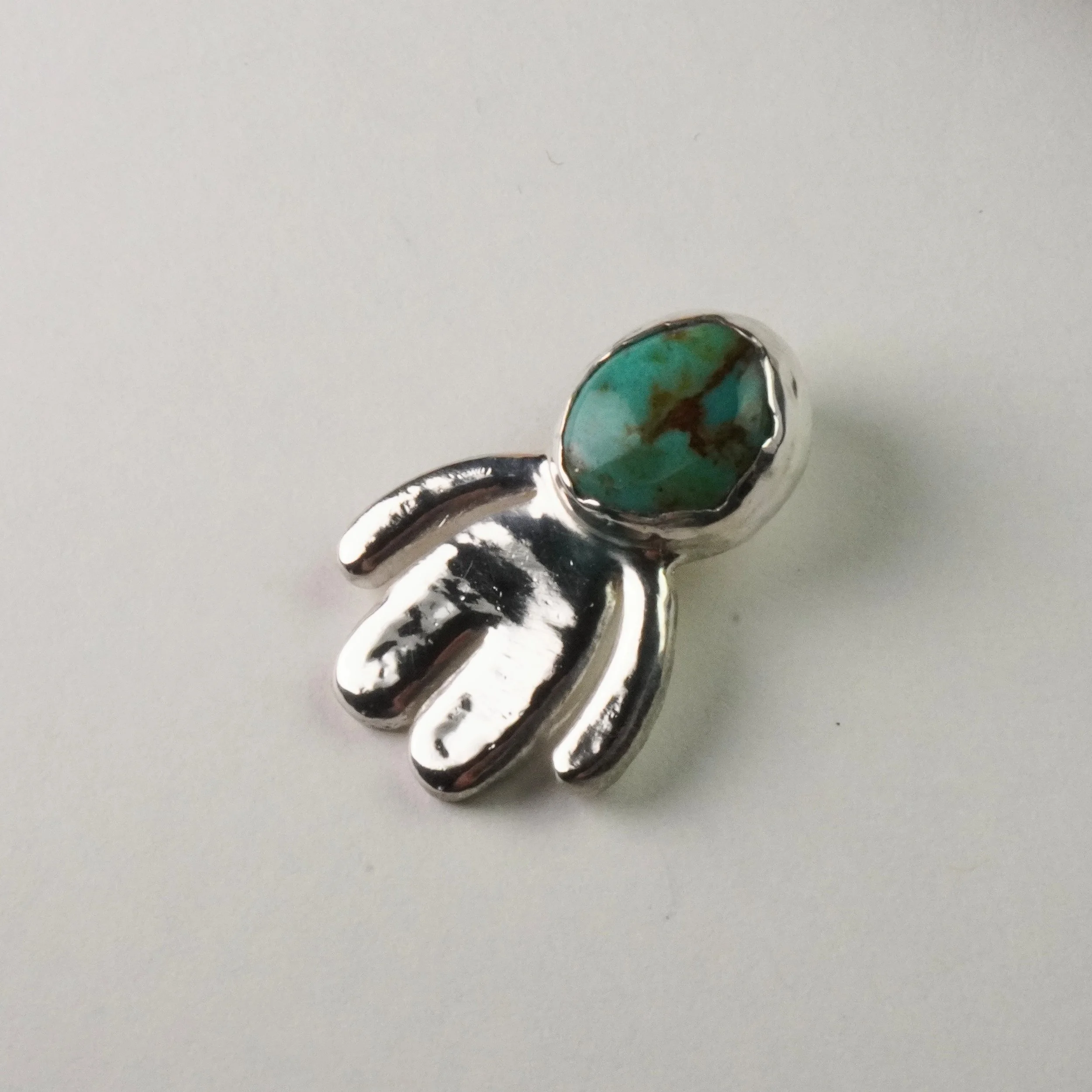 Hand holding a silver necklace with a pendant featuring turquoise stone.