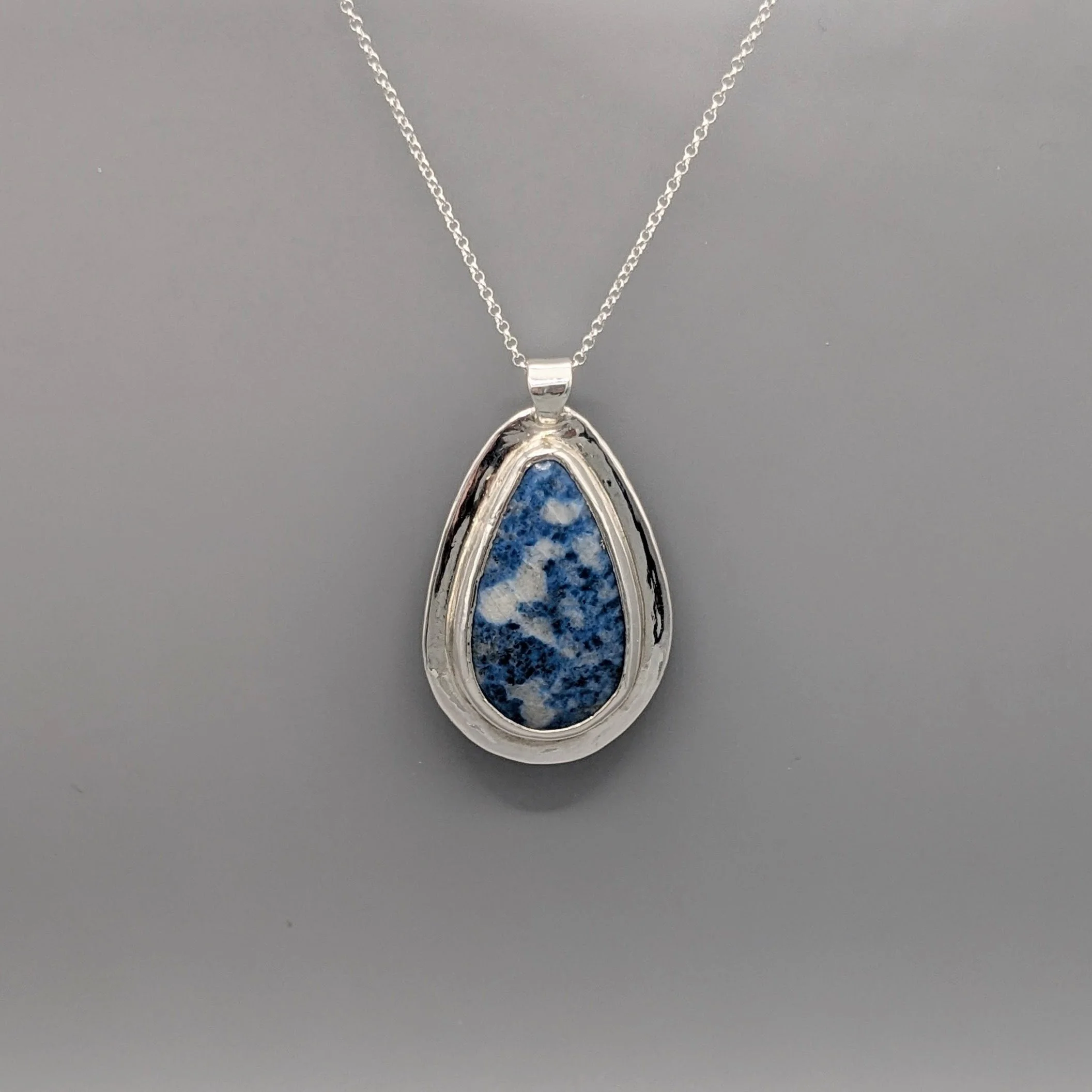 Silver necklace with a large, teardrop-shaped blue and white stone pendant.