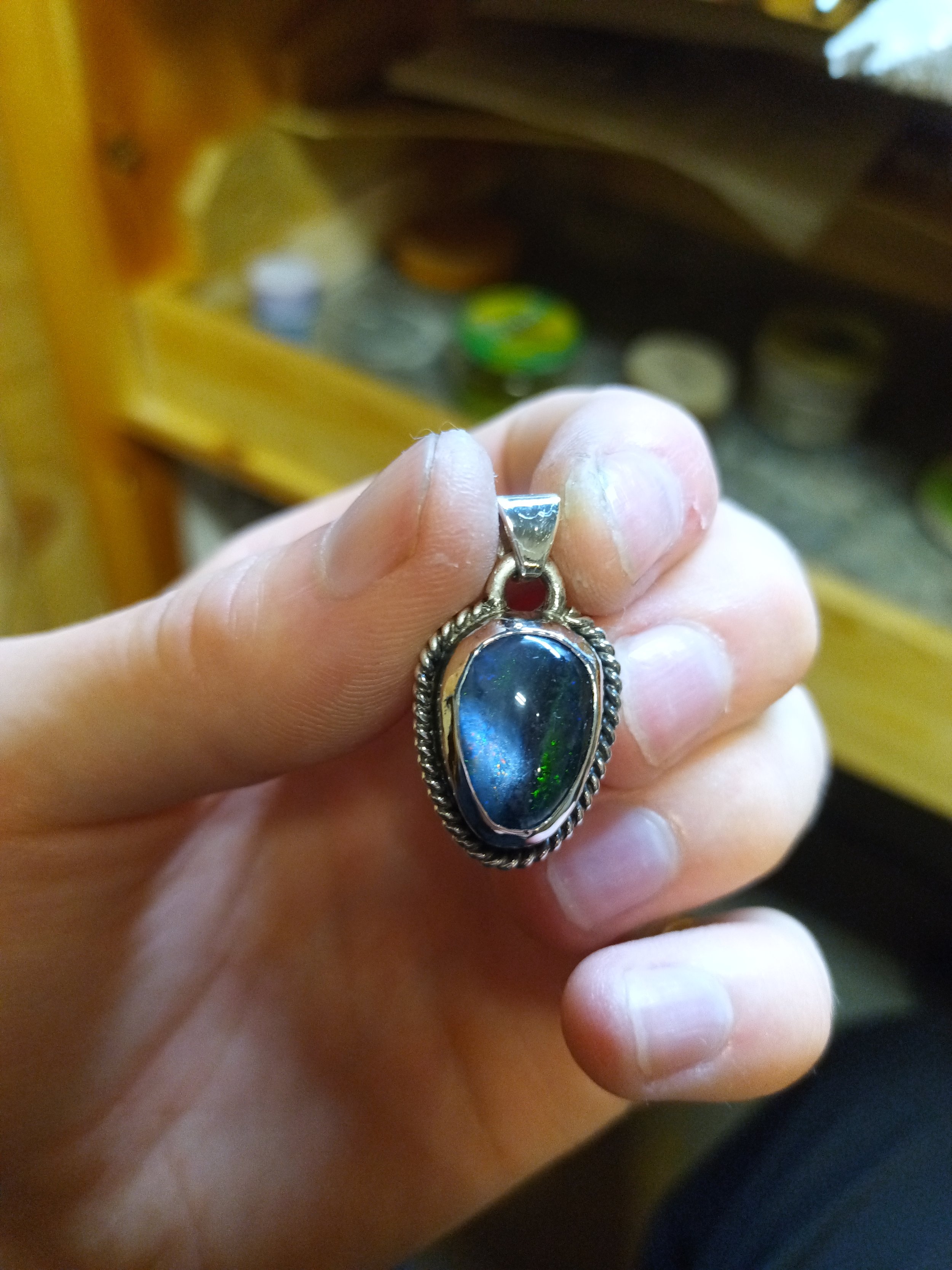 A person holding a silver pendant with a large, oval-shaped opal gemstone that displays blue and green colors.