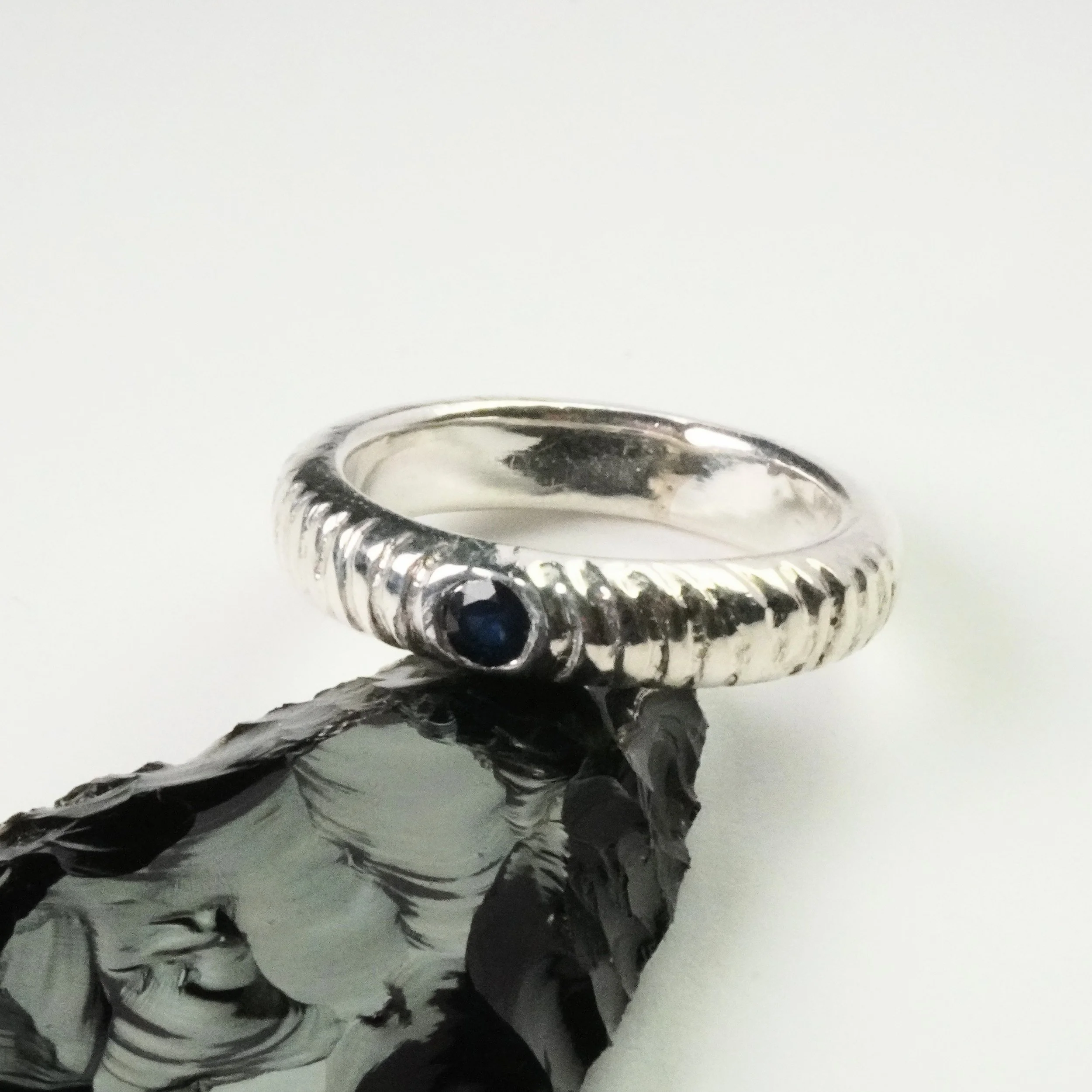 Silver ring with ridged edges and a small dark blue gemstone, placed on a textured black surface against a white background.